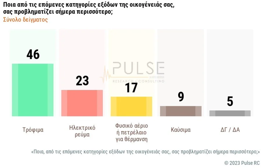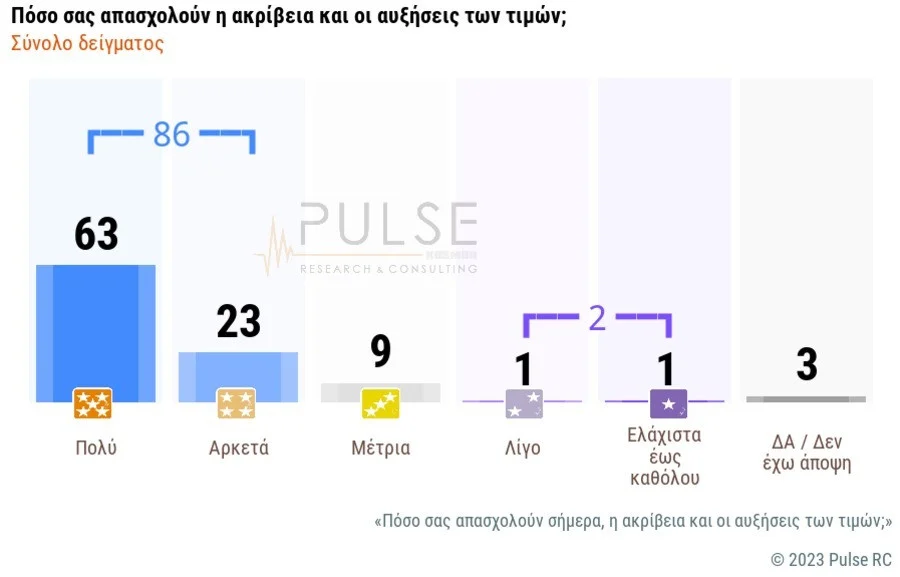 Η ακρίβεια αναδεικνύεται σε υπ’ αριθμόν ένα πρόβλημα για τους πολίτες, αφού σχεδόν οι εννέα στους δέκα, στη μεγάλη δημοσκόπηση της Pulse που παρουσιάστηκε στο κεντρικό δελτίο ειδήσεων του Σκάι με τη Σία Κοσιώνη, δηλώνουν ότι η ακρίβεια και οι αυξήσεις των τιμών τους απασχολούν πολύ (63%) και αρκετά (23%). Μάλιστα, σχεδόν οι μισοί δηλώνουν ότι τα τρόφιμα είναι η κατηγορία των οικογενειακών εξόδων που τους προβληματίζει περισσότερο.