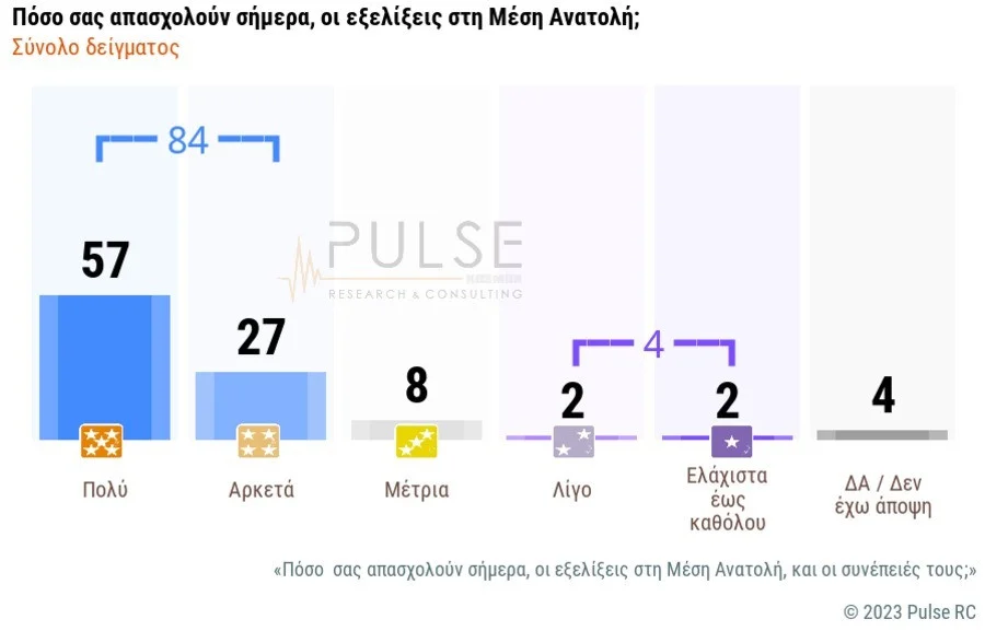 Την ίδια ώρα, σύμφωνα με τη δημοσκόπηση οι πολίτες ανησυχούν για τις εξελίξεις στη Μέση Ανατολή με το 84% να δηλώνει ότι οι εξελίξεις τους απασχολούν «πολύ» (57%) ή «αρκετά» (27%).