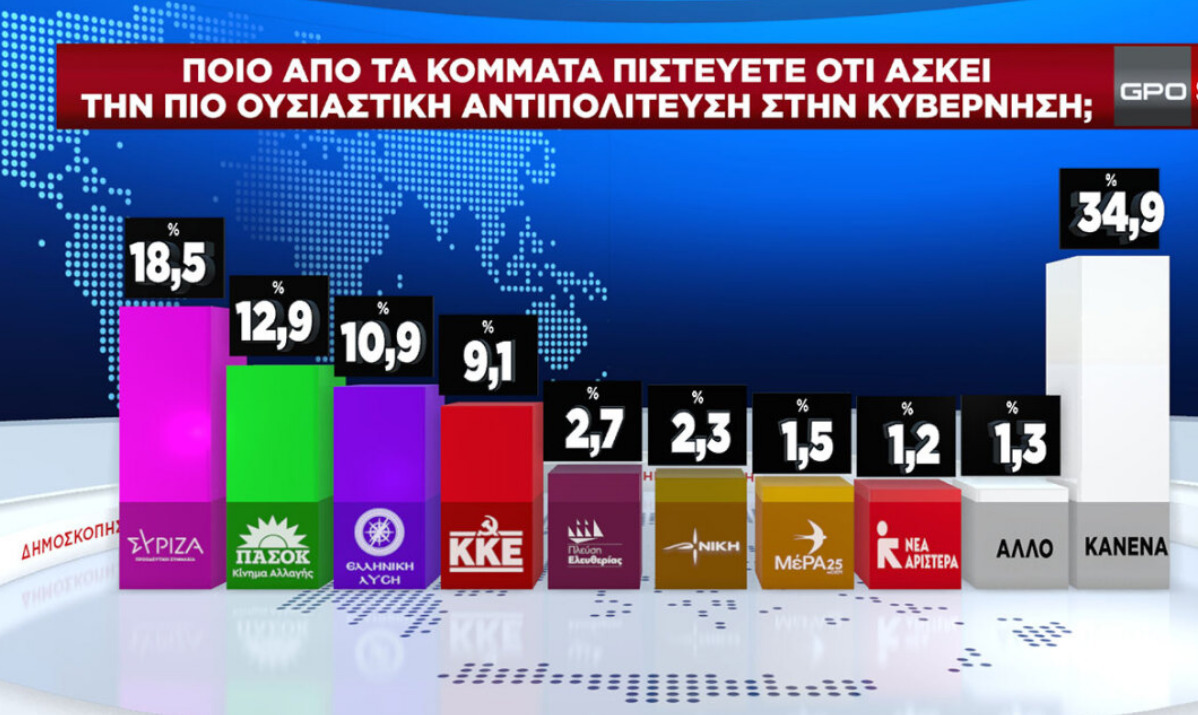 Μείωση του ποσοστού της ΝΔ και η σταθεροποίηση στη δεύτερη θέση θα ενισχύσει και την ηγεσία Κασσελάκη, ο οποίος κυριολεκτικά έχει πάρει «πάνω του», την προεκλογική καμπάνια του κόμματος. Αυτό προκαλεί εσωκομματικές γκρίνιες και δυσαρέσκειες, οι οποίες προς το παρόν παραμένουν κάτω από το χαλί, αλλά θα εμφανιστούν δυνατά στο προσκήνιο αν το κόμμα αποτύχει να ανακάμψει και να εκπέμψει μηνύματα αισιοδοξίας. Δεν είναι μάλιστα καθόλου τυχαία τα δημοσιεύματα και οι διαρροές για «λευκή απεργία», προεκλογικά, κάποιων βουλευτών, που παλιότερα απολάμβαναν τα προνόμια του προεδρικού περιβάλλοντος.