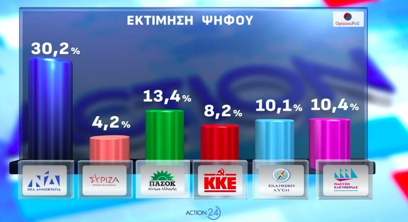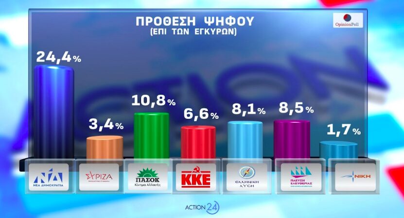 Στην πρόθεση ψήφου της δημοσκόπησης, η Ν.Δ. φτάνει το 24,4% και το ΠΑΣΟΚ στο 10,8% – Στο 19,1% οι αναποφάσιστοι.