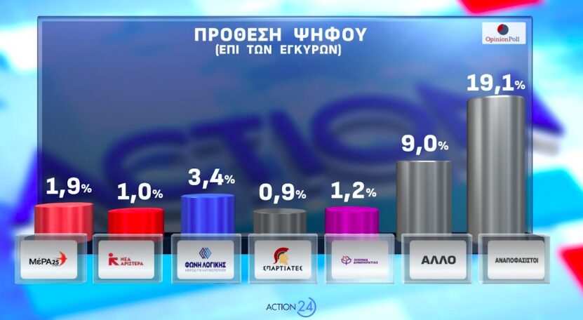 Ακόμα, ο ΣΥΡΙΖΑ καταγράφει 3,4%, η Φωνή Λογικής επίσης 3,4%, η Νίκη 1,7%, το ΜέΡΑ25 1,9%, η Νέα Αριστερά 1%, οι Σπαρτιάτες 0,9% και το Κίνημα Δημοκρατίας 1,2%. Οι αναποφάσιστοι ανέρχονται στο 19,1%.