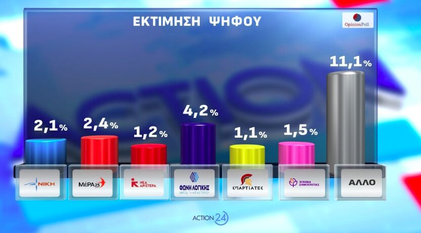 Έπειτα, στη δημοσκόπηση της Opinion Poll ακολουθούν η Φωνή Λογικής με 4,2%, το ΜέΡΑ25 με 2,4%, η Νίκη με 2,1%, η Νέα Αριστερά με 1,2%, το Κίνημα Δημοκρατίας με 1,5% και οι Σπαρτιάτες με 1,1%. Το 11,1% δηλώνει ότι θα ψηφίσει άλλο κόμμα.