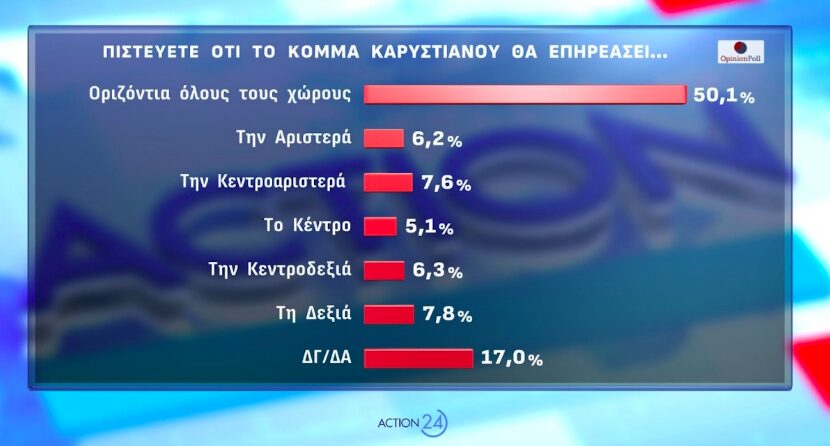 Όσον αφορά στο ποιον πολιτικό χώρο θα επηρεάσει το υπό δημιουργία κόμμα της Μαρίας Καρυστιανού, η πλειονότητα των ερωτηθέντων (50,1%) πιστεύει ότι θα επηρεάσει οριζόντια όλους τους χώρους. Το 7,8% εκτιμά ότι θα επηρεάσει τη Δεξιά, το 7,6% την Κεντροαριστερά, το 6,3% την Κεντροδεξιά, το 6,2% την Αριστερά και το 5,1% το Κέντρο. Το 17% δεν γνωρίζει ή δεν απαντά.