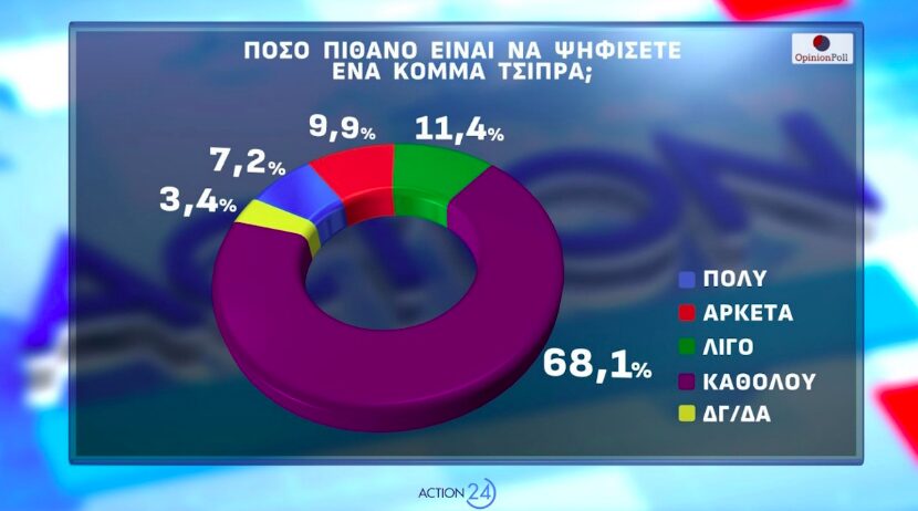 Αντίθετα, η προοπτική ενός κόμματος υπό τον Αλέξη Τσίπρα δεν φαίνεται να συγκινεί το εκλογικό σώμα. Μόλις το 7,2% δηλώνει ότι είναι «πολύ» πιθανό να το ψηφίσει και το 9,9% «αρκετά». Το 11,4% των συμμετεχόντων στη δημοσκόπηση της Opinion Poll απαντά «λίγο», ενώ η συντριπτική πλειονότητα του 68,1% απαντά «καθόλου». Το 3,4% δεν γνωρίζει ή δεν απαντά.