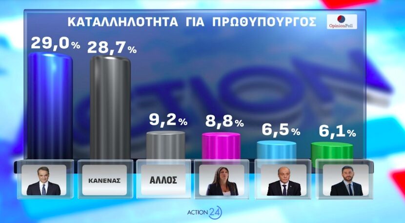 Στην ερώτηση για την καταλληλότητα για τη θέση του πρωθυπουργού, ο Κυριάκος Μητσοτάκης προηγείται με 29%, ακολουθούμενος από την επιλογή «Κανένας» με 28,7%. Η Ζωή Κωνσταντοπούλου συγκεντρώνει 8,8%, ο Κυριάκος Βελόπουλος 6,5% και ο Νίκος Ανδρουλάκης 6,1%. Το 9,2% επιλέγει «Άλλος».