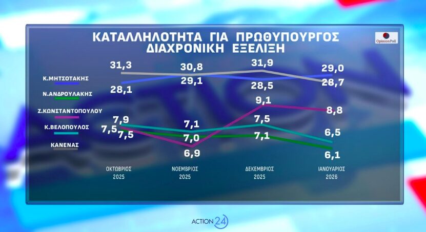 Η διαχρονική εξέλιξη του δείκτη δείχνει σχετική σταθερότητα. Ο Μητσοτάκης κινείται από 31,3% τον Οκτώβριο 2025 στο 29% τον Ιανουάριο 2026. Ο Νίκος Ανδρουλάκης παραμένει σταθερός, από 28,1% στο 28,7%. Η Ζωή Κωνσταντοπούλου καταγράφει άνοδο από 7,9% στο 8,8%.