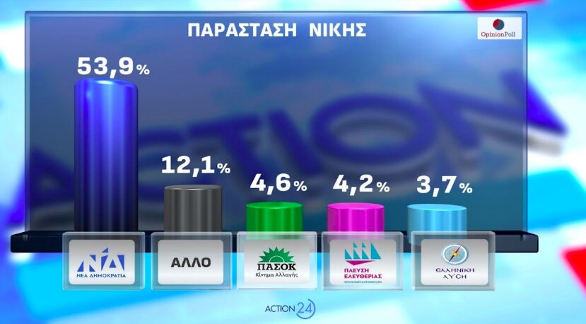 Στην παράσταση νίκης, η Ν.Δ. καταγράφει 53,9% και ακολουθεί η επιλογή «Άλλο» με 12,1%, το ΠΑΣΟΚ με 4,6%, η Πλεύση Ελευθερίας με 4,2% και η Ελληνική Λύση με 3,7%.