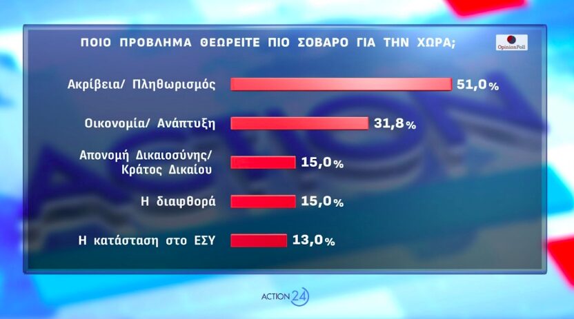 Η ακρίβεια και ο πληθωρισμός αποτελούν το σημαντικότερο πρόβλημα για τους πολίτες, με ποσοστό 51%. Έπειτα, στη δημοσκόπηση της Opinion Poll ακολουθεί η οικονομία και η ανάπτυξη με 31,8%, η απονομή Δικαιοσύνης και το κράτος Δικαίου με 15%, η διαφθορά επίσης με 15% και η κατάσταση στο ΕΣΥ με 13%.