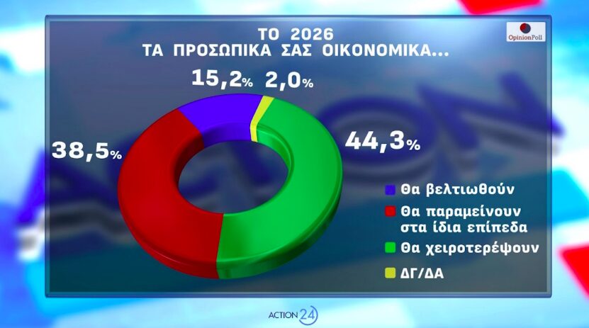 Σχετικά με τις οικονομικές προσδοκίες για το 2026, το 44,3% πιστεύει ότι τα προσωπικά του οικονομικά θα χειροτερέψουν, το 38,5% ότι θα μείνουν στα ίδια επίπεδα και μόλις το 15,2% ότι θα βελτιωθούν.