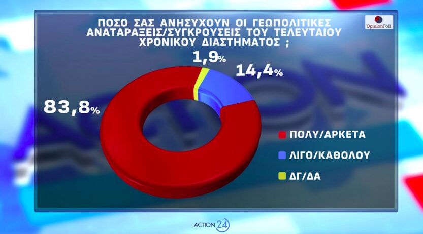 Οι γεωπολιτικές αναταράξεις του τελευταίου χρονικού διαστήματος ανησυχούν πολύ ή αρκετά το 83,8% των ερωτηθέντων στη δημοσκόπηση της Opinion Poll. Μόλις το 14,4% δηλώνει ότι ανησυχεί λίγο ή καθόλου.