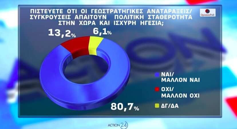 Παράλληλα, το 80,7% πιστεύει ότι οι γεωστρατηγικές αναταράξεις απαιτούν πολιτική σταθερότητα στη χώρα και ισχυρή ηγεσία, ενώ αντίθετη άποψη έχει το 13,2%, ενώ το 6,1% δεν γνωρίζει ή δεν απαντά.