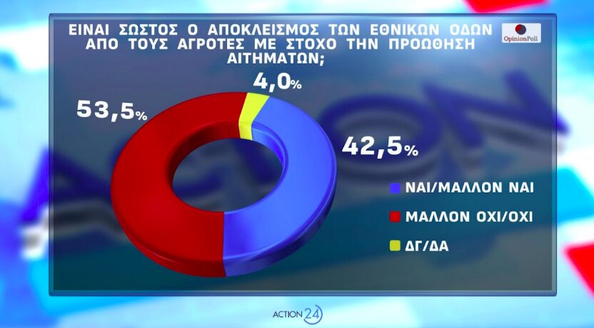 Στο ζήτημα των αγροτικών κινητοποιήσεων, το 42,5% θεωρεί σωστό τον αποκλεισμό των εθνικών οδών από τους αγρότες για την προώθηση των αιτημάτων τους, ενώ το 53,5% διαφωνεί.
