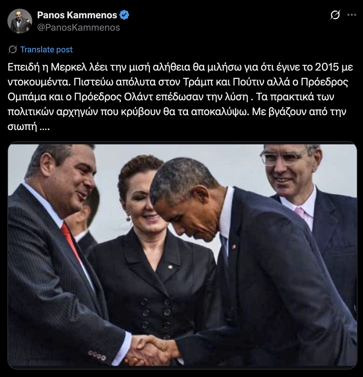 «Επειδή η Μερκελ λέει την μισή αλήθεια θα μιλήσω για ότι έγινε το 2015 με ντοκουμέντα. Πιστεύω απόλυτα στον Τράμπ και Πούτιν αλλά ο Πρόεδρος Ομπάμα και ο Πρόεδρος Ολάντ επέδωσαν την λύση. Τα πρακτικά των πολιτικών αρχηγών που κρύβουν θα τα αποκαλύψω. Με βγάζουν από την σιωπή», έγραψε ο Πάνος Καμμένος.