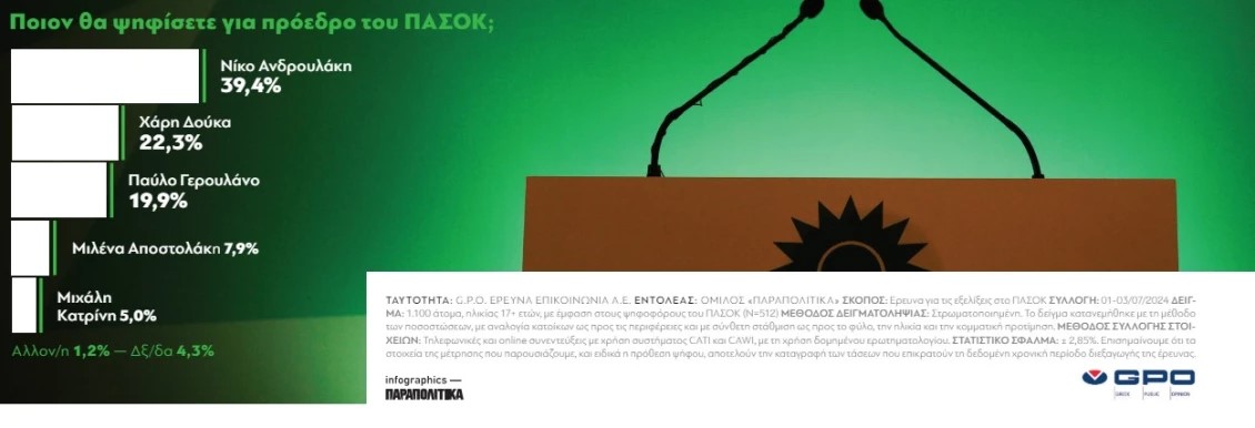 Με μεγάλη διαφορά βρίσκεται ο Νίκος Ανδρουλάκης στην πρώτη θέση των προτιμήσεων των πολιτών, προκειμένου να συνεχίσει να είναι πρόεδρος του ΠΑΣΟΚ και μετά τις εσωκομματικές εκλογές του Οκτωβρίου, όπως αποτυπώνεται στη δημοσκόπηση της GPO για την εφημερίδα «Παραπολιτικά».