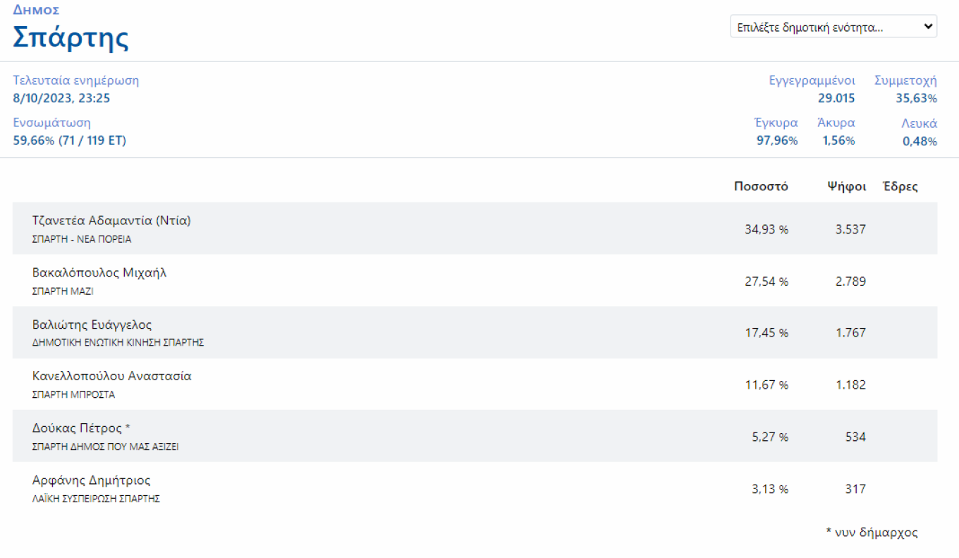 Δείτε τα αποτελέσματα των εκλογών στο Δήμο Σπάρτης με ενσωματωμένο το 59,66% των ψηφοδελτίων: