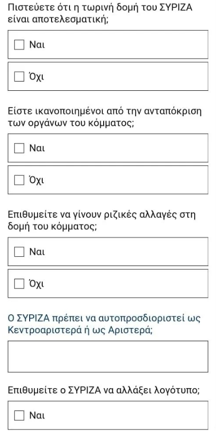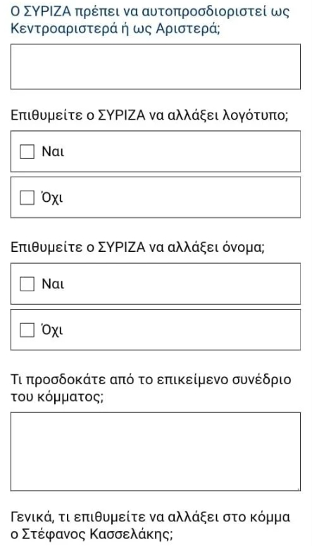 Στο σχετικό ερωτηματολόγιο τίθεται το ερώτημα εάν ο ΣΥΡΙΖΑ πρέπει να αυτοπροσδιορίζεται ως Κεντροαριστερά ή ως Αριστερά.