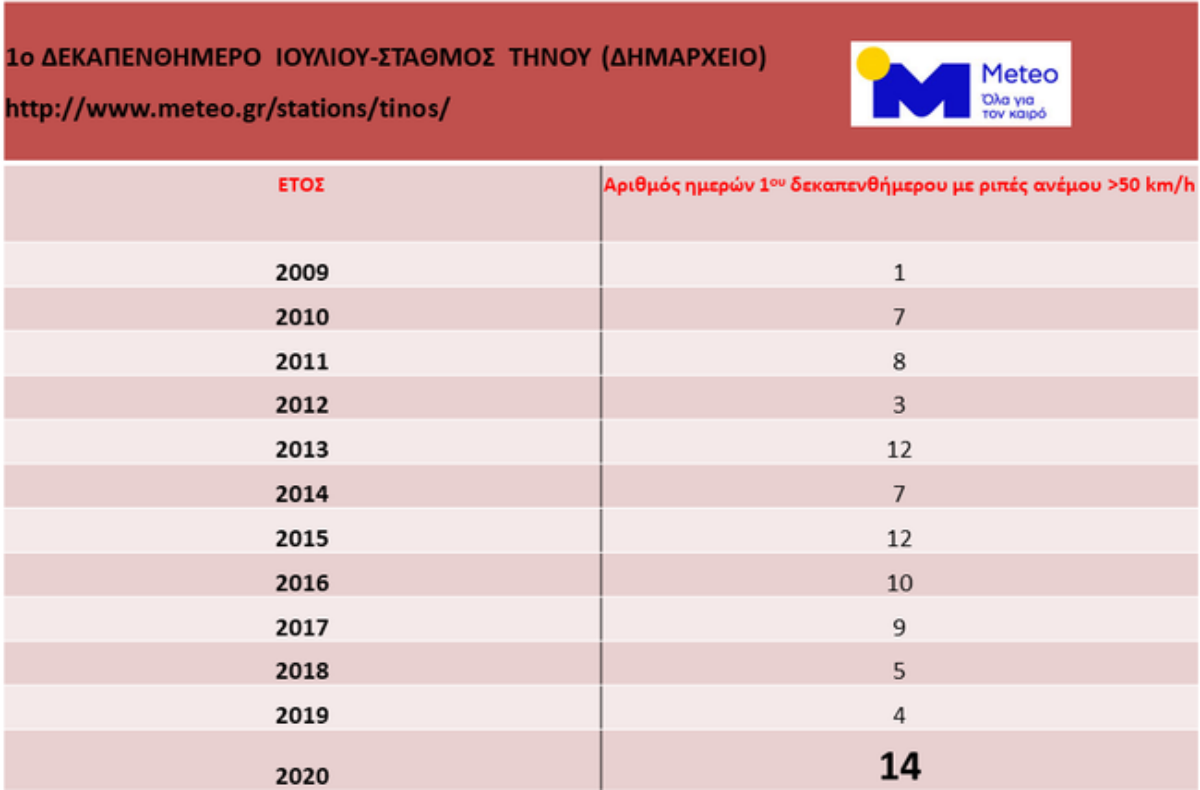 Ο πίνακας που ακολουθεί δίνει τις ημέρες με ισχυρό μελτέμι στο Αιγαίο από το 2009 ως και το 2020 για το πρώτο δεκαπενθήμερο του Ιουλίου. Ως κριτήριο για τον χαρακτηρισμό της ημέρας τέθηκε το όριο των 50 km/h ως μέγιστη ριπή ανέμου στο σταθμό του Εθνικού Αστεροσκοπείου Αθηνών/Meteo.gr στην Τήνο-Δημαρχείο.