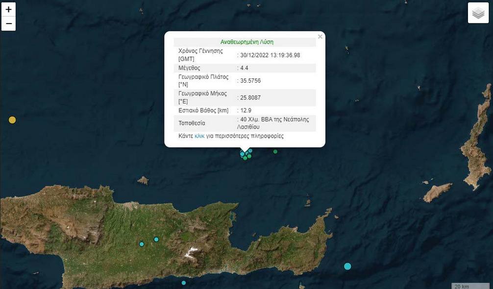 Ο σεισμός είχε εστιακό βάθος 12.9 χιλιομέτρων και επίκεντρο 40 χιλιόμετρα βόρεια βορειοανατολικά της Νεάπολης Λασιθίου, σύμφωνα με την αυτόματη λύση από το Γεωδυναμικό Ινστιτούτο.