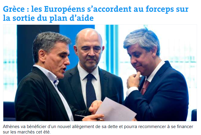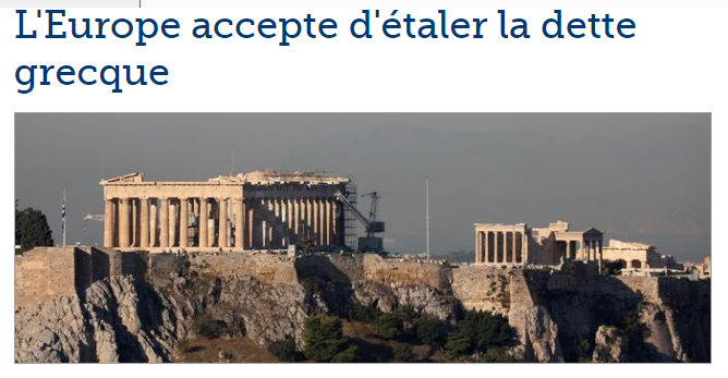 * Στην ηλεκτρονική έκδοση της Le Figaro το θέμα καταλαμβάνει τη δεύτερη θέση, υπό τον τίτλο «Η ευρωζώνη συμφωνεί στην ελάφρυνση του ελληνικού χρέους», δύο μήνες πριν από την τυπική ολοκλήρωση του τρίτου προγράμματος στήριξης.