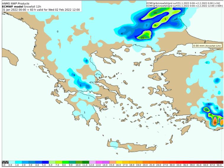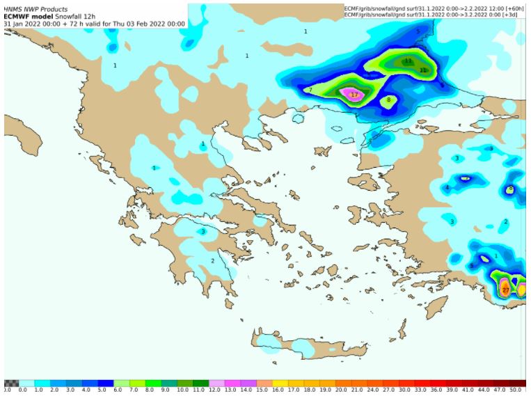 Αυτό διακρίνεται πολύ καλά στη συνολική χιονόπτωση 12ωρου από Τετάρτη μεσημέρι και μετά.
