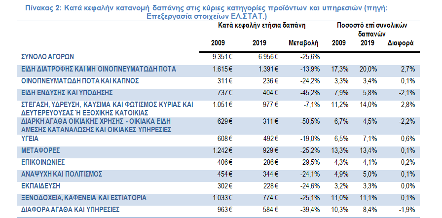 Αξίζει να σημειωθεί ότι ενώ η δαπάνη των νοικοκυριών σε είδη παντοπωλείου σε αξία μειώθηκε την τελευταία δεκαετία, η δαπάνη ως ποσοστό επί των συνολικών αγορών των νοικοκυριών αυξήθηκε. Το 2009 η δαπάνη σε είδη διατροφής αντιστοιχούσε στο 17,3% των αγορών του μέσου νοικοκυριού, ενώ το 2019 αντιστοιχούσε στο 20,0% αυξήθηκε δηλαδή κατά 2,7%. Πρακτικά δηλαδή ενώ η δαπάνη σε είδη παντοπωλείου μειώθηκε, οι υπόλοιπες δαπάνες (π.χ. είδη ένδυσης, είδη επίπλωσης, υπηρεσίες) μειώθηκαν με ακόμα μεγαλύτερο ρυθμό (βλ. πίνακας 2). Η εξέλιξη αυτή είναι σε ένα βαθμό αναμενόμενη καθώς τα περισσότερα από τα προϊόντα παντοπωλείου και ειδικά τα είδη διατροφής εξυπηρετούν βασικές ανάγκες του καταναλωτή και κατά συνέπεια είναι πιο δύσκολο να περικοπούν σε περιόδους οικονομικής ύφεσης, αλλά δεν εξηγείται σε άλλες περιόδους, καθώς την τελευταία 5ετία το ποσοστό αυτό είναι λίγο πολύ σταθερό.