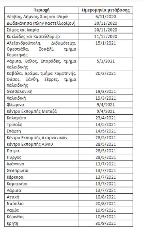 Η διαδικασία της μετάβασης θα έχει ολοκληρωθεί στο τέλος Σεπτεμβρίου 2021 με τελευταία περιοχή στην οποία θα αποδεσμευτούν οι ραδιοσυχνότητες των 700 MHz να είναι η Κρήτη. Για τις περιοχές της Θεσσαλονίκης και της Αττικής η μετάβαση προβλέπεται να πραγματοποιηθεί στις 19 Μαρτίου 2021 και 10 Αυγούστου 2021 αντίστοιχα.