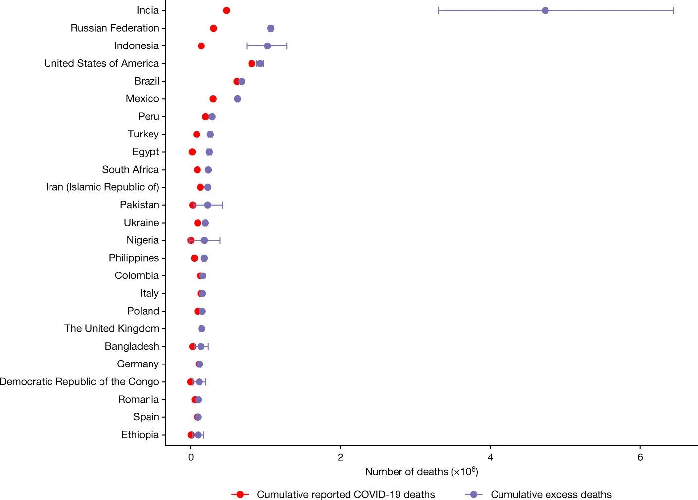Σύμφωνα με τις εκτιμήσεις του ΠΟΥ, η Ινδία είχε πολύ περισσότερους υπερβάλλοντες θανάτους που συνδέονται με την πανδημία από οποιαδήποτε άλλη χώρα. Συγκεκριμένα, εκτιμάται ότι οι θάνατοι ανέρχονται στα 4,7 εκατομμύρια – περίπου 10 φορές περισσότεροι από τον επίσημο απολογισμό που έχει ανακοινώσει η ινδική κυβέρνηση.