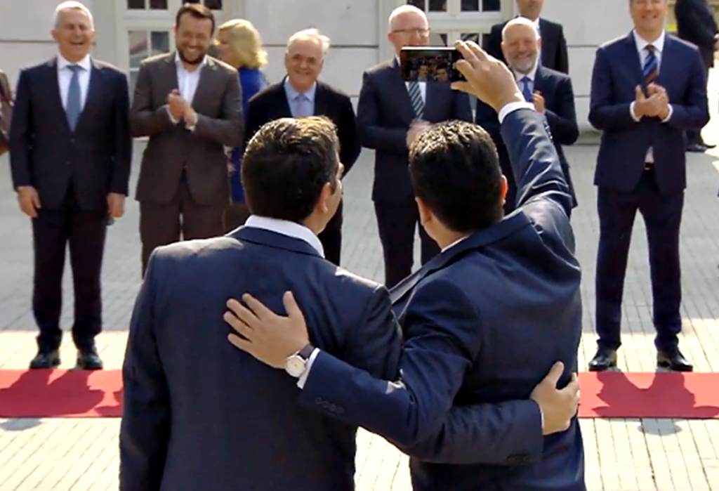 Στη συνέχεια, οι δύο ηγέτες προχώρησαν προς τους φωτορεπόρτερς και τους υπουργούς των δύο χωρών, όπου έβγαλαν σέλφι με το κινητό τηλέφωνο του πρωθυπουργού της Βόρειας Μακεδονίας.
