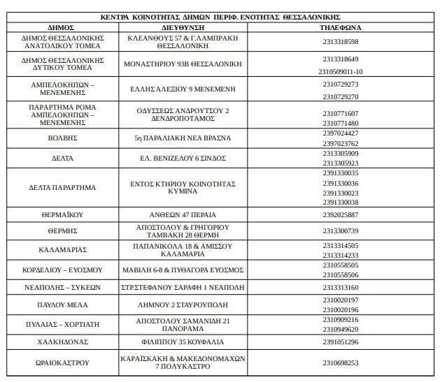 Ο κατάλογος των Κέντρων Κοινότητας της Περιφερειακής Ενότητας Θεσσαλονίκης: