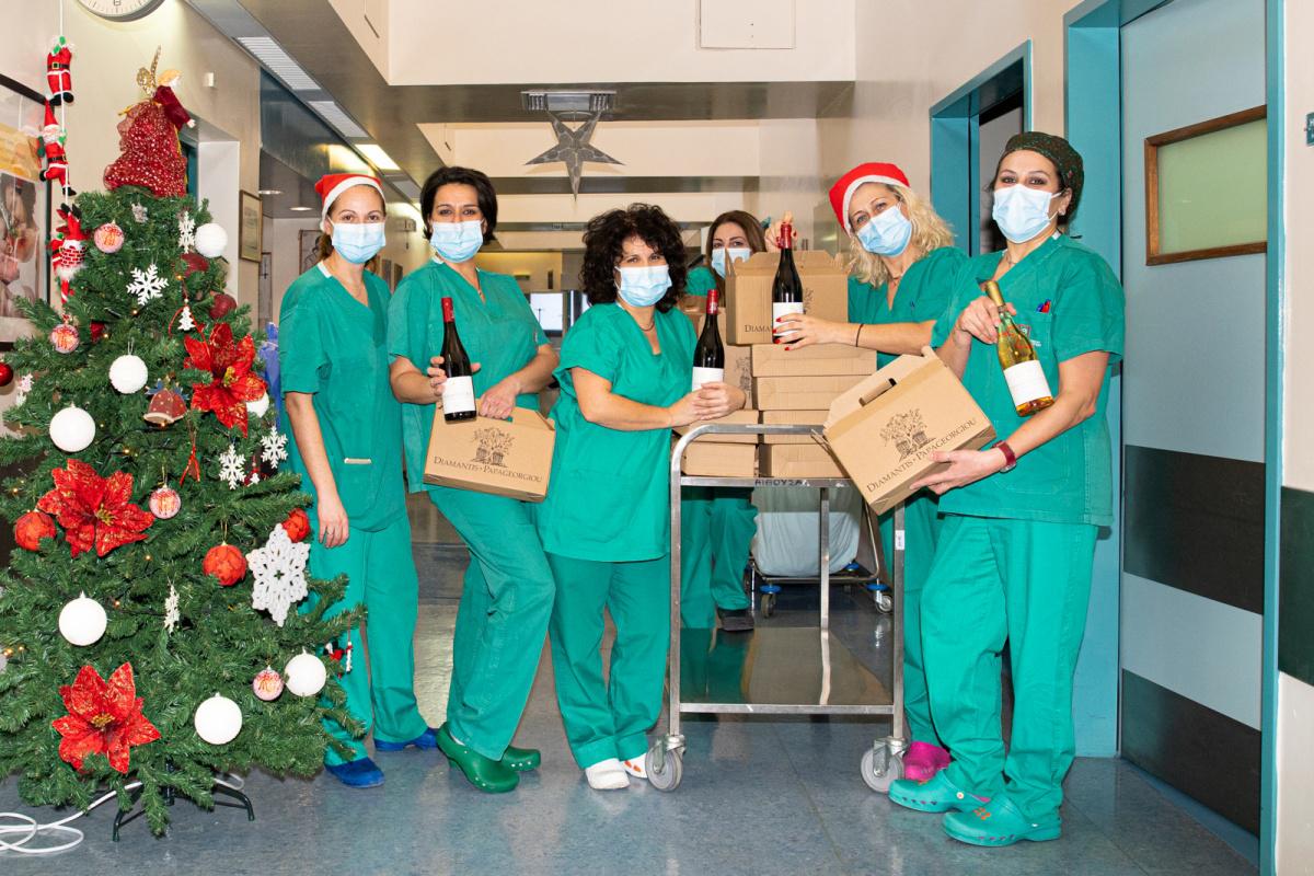 Τα εκλεκτά κρασιά, ένα ερυθρό και ένα ροζέ, που παράγει η Οινοποιία Διαμαντή-Παπαγεωργίου από αυτόχθονες ελληνικές ποικιλίες από την οινοπαραγωγική ζώνη της Σιάτιστας και το αμπελοτόπι Μαγκούτες, διανεμήθηκαν, μαζί με τις εγκάρδιες ευχές του Ιδρύματος Παπαγεωργίου στους περίπου 2.000 εργαζόμενους στο Νοσοκομείο.