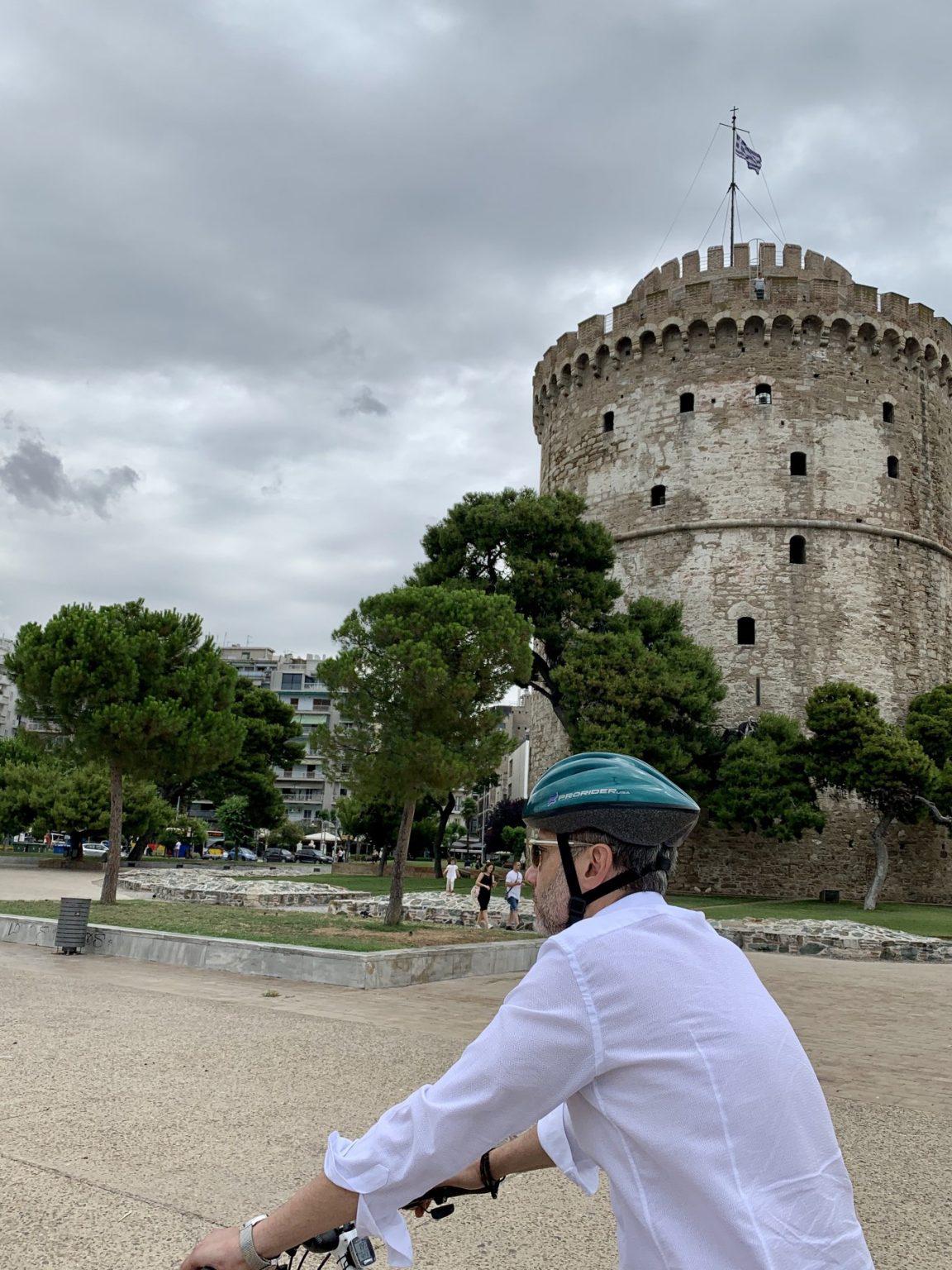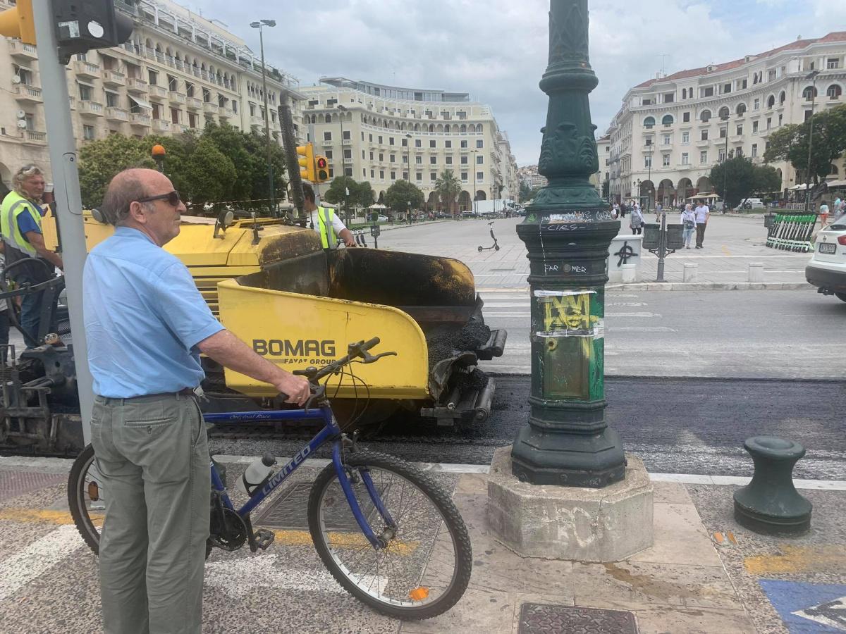 Με το ποδήλατό του έφτασε σήμερα το πρωί ο Δήμαρχος Θεσσαλονίκης Κωνσταντίνος Ζέρβας στη Λεωφόρο Νίκης, για να επιθεωρήσει τις εργασίες που βρίσκονται σε εξέλιξη για τη μεταφορά του ποδηλατόδρομου από το πλακόστρωτο της παλιάς παραλίας στο οδόστρωμα.