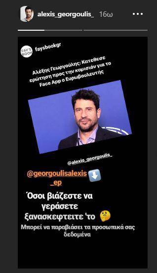 Σε story του στο Instagram, o Αλέξης Γεωργούλης έγραψε «Όσοι βιάζεστε να γεράσετε, ξανασκεφτείτε το. Μπορεί να παραβιάσει τα προσωπικά σας δεδομένα».