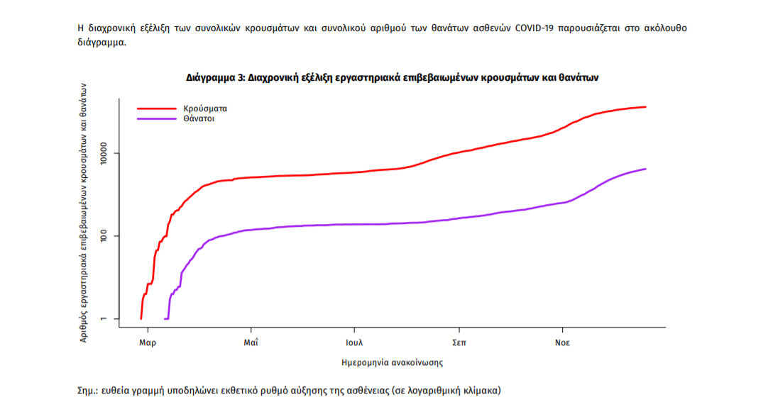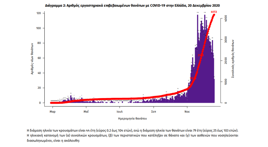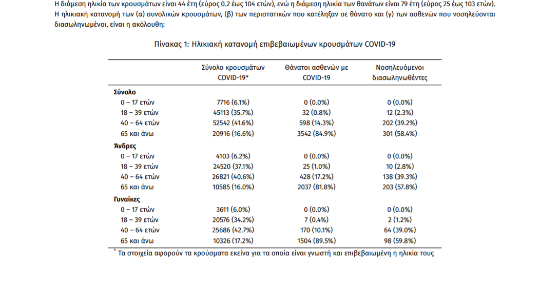 Τέλος, έχουμε 70 ακόμα καταγεγραμμένους θανάτους και 4172 θανάτους συνολικά στη χώρα. 1682 (40.3%) γυναίκες και οι υπόλοιποι άνδρες. Η διάμεση ηλικία των θανόντων συμπολιτών μας ήταν τα 79 έτη και το 95.7% είχε κάποιο υποκείμενο νόσημα ή/και ηλικία 70 ετών και άνω.