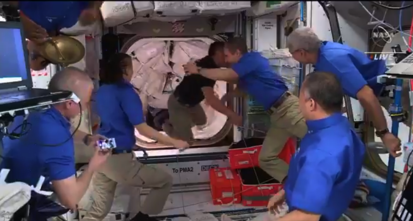 Their arrival means there are now 11 humans aboard our orbiting laboratory, a number not seen since the space shuttle era. Hugs abound. pic.twitter.com/uSwW3JFl6K