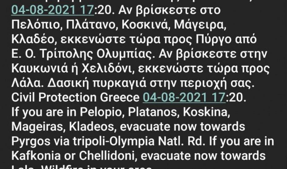 «Αν βρίσκεστε στο Πελόπιο, Πλάτανο, Κοσκινά, Μάγειρα και Κλαδέο, εκκενώστε τώρα προς Πύργο από Εθνική Οδό Τρίπολης-Ολυμπίας. Αν βρίσκεστε, στην Καυκωνιά ή Χελιδόνι, εκκενώστε τώρα προς Λάλα. Δασική πυρκαγιά στην περιοχή σας», αναφέρει χαρακτηριστικά.