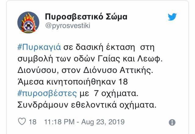Η πυρκαγιά, που εκδηλώθηκε στη συμβολή των οδών Γαίας και Λεωφόρου Διονύσου, είναι πλέον σε ύφεση, ενώ δεν κινδύνευσαν σπίτια που βρίσκονται στην περιοχή. Στο σημείο επιχειρούν 25 πυροσβέστες με 10 οχήματα, καθώς και εθελοντές που συνδράμουν στο έργο των πυροσβεστικών δυνάμεων.