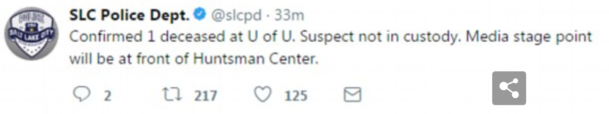 Τουλάχιστον ένας νεκρός από πυροβολισμούς στις εγκαταστάσεις του πανεπιστημίου στην Γιούτα των ΗΠΑ. Ο ένοπλος περιγράφεται ως λευκός άντρας, με μαύρη περιβολή και τατουάζ στο πρόσωπο του, διέφυγε και αναζητείται από τις αστυνομικές αρχές. Το πανεπιστήμιο ειδοποίησε σχετικά τους σπουδαστές να παραμείνουν στις εστίες τους.