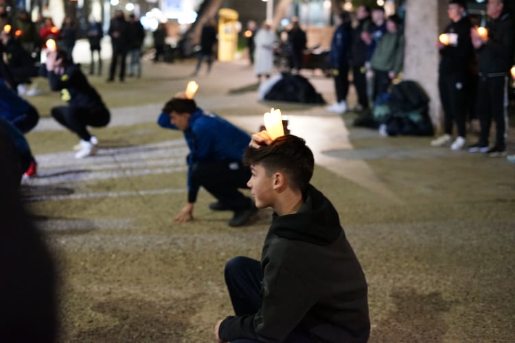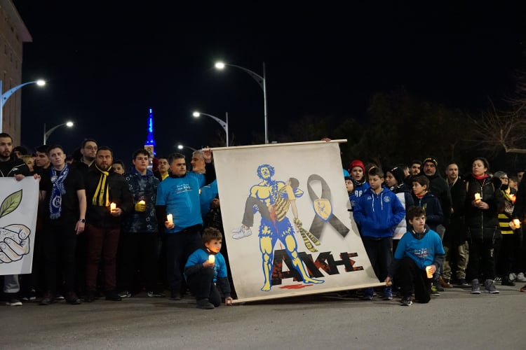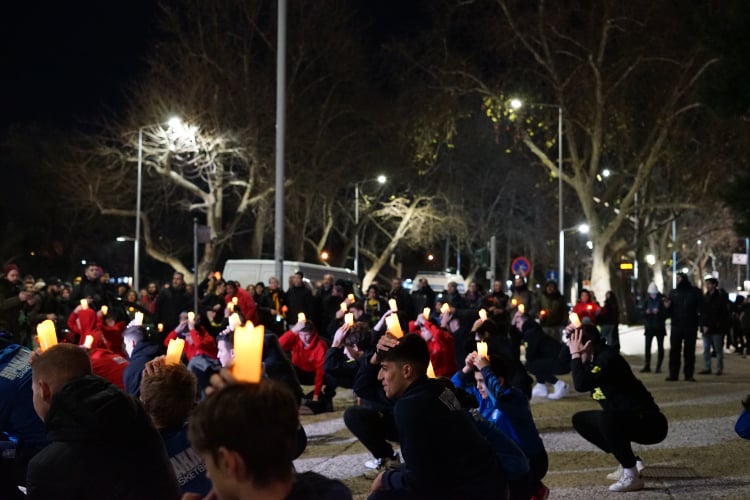 Παίκτες των ομάδων Κ12 του Άρη, του ΠΑΟΚ, του Ηρακλή, της ΧΑΝΘ τοποθέτησαν κεριά στα κεφάλια τους σχηματίζοντας το όνομα του Άλκη.