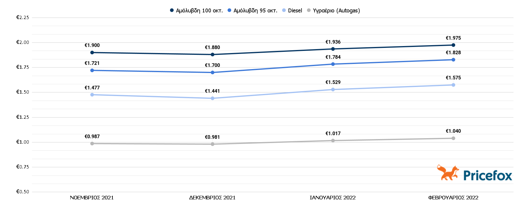Συνεχίζεται το Ράλι τιμών με τις στην απλή αμόλυβδη να φτάνει από 1,721€/λίτρο στο 1,828€/λίτρο ενώ παράλληλα η ενισχυμένη βενζίνη έφτασε τα 1,975€/λίτρο μέσα στον Φεβρουάριο. Η μέση τιμή για τους οδηγούς πετρελαιοκίνητων αγγίζει το 1,575€/λίτρο από 1,477€/λίτρο που ήταν το Νοέμβριο. Η μεγαλύτερη έκπληξη είναι οι τιμές του υγραερίου που φτάνουν το 1,040€/λίτρο ενώ τέσσερις μήνες πριν η μέση τιμή ήταν στο 0,987€/λίτρο.
