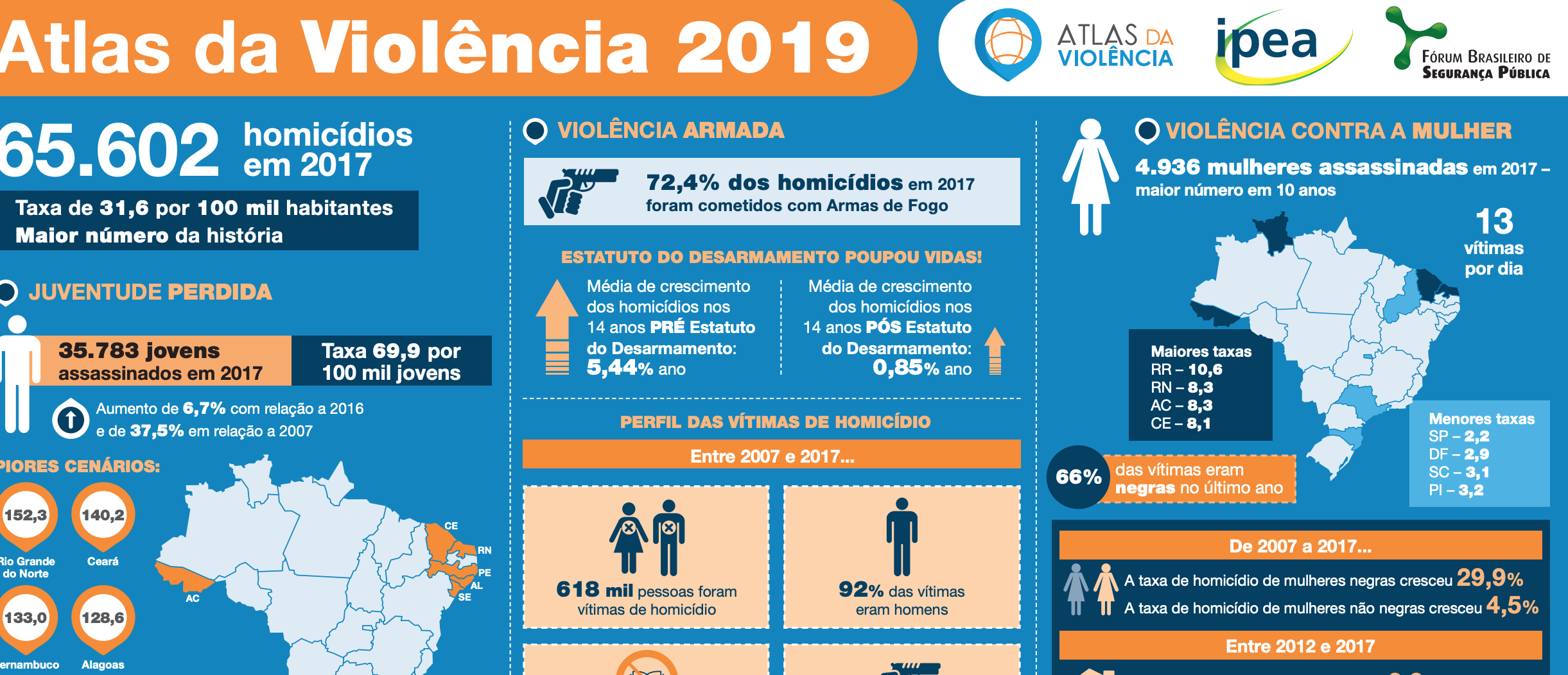 Σύμφωνα με τον «Άτλαντα της Βίας», που καταρτίζει η ΜΚΟ Βραζιλιάνικο Φόρουμ για τη Δημόσια Ασφάλεια (FBSP) σε συνεργασία με το βραζιλιάνικο Ινστιτούτο Εφαρμοσμένων Οικονομικών Ερευνών (IPEA), ο δείκτης των ανθρωποκτονιών ανήλθε σε 31,6 ανά 100.000 κατοίκους το 2017.