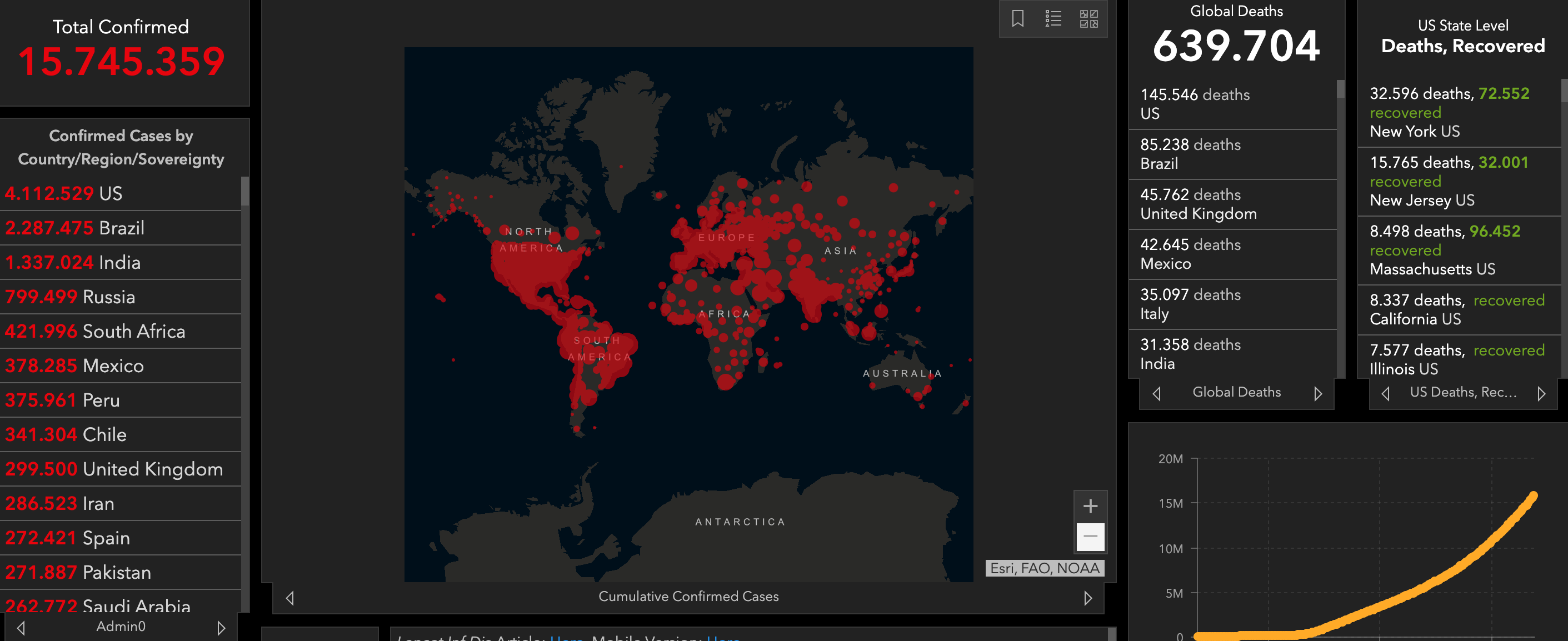 Τουλάχιστον επτά χώρες κατέγραφαν ημερήσια ρεκόρ πριν τρεις εβδομάδες, ο αριθμός τους αυξήθηκε σε τουλάχιστον 13 πριν δύο εβδομάδες, για να φτάσει την προηγούμενη εβδομάδα στις 20 και αυτή την εβδομάδα στις 37 χώρες. Οι ΗΠΑ παραμένουν στην κορυφή του καταλόγου με τα περισσότερα κρούσματα covid-19 παγκοσμίως, καθώς αυτή την εβδομάδα ξεπέρασαν τα 4 εκατομμύρια, ενώ επί τέσσερις συνεχείς ημέρες στη χώρα καταγράφονταν περισσότεροι από 1.000 θάνατοι ημερησίως. Η Βραζιλία και η Ινδία –όπου σύμφωνα με τους επιδημιολόγους η κορύφωση της επιδημίας απέχει πιθανόν μήνες—έχουν καταγράψει περισσότερα από 1 εκατομμύριο κρούσματα.
