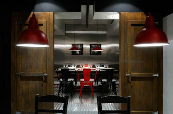 Στον όροφο ο χώρος οργανώνεται συμμετρικά, με μεγάλα παγκάκια που αναπτύσσονται κατά μήκος των τοίχων, ενώ στο βάθος υπάρχει ένα ειδικά διαμορφωμένο αίθριο, όπου μπορεί κανείς να γευτεί διάφορες λιχουδιές καθήμενος σε ψηλά σκαμπώ γύρω από ξύλινα «χασαποτράπεζα». Στο μαγαζί κυριαρχεί η αντίθεση λευκού-μαύρου, με το κόκκινο να τονίζει το συμβολικό χαρακτήρα του. Το μεγαλύτερο τμήμα των τοίχων έχει καλυφθεί με λευκό κεραμικό πλακάκι, το δάπεδο καλύπτεται με μεγάλα γκρι πλακίδια, ενώ όπου δεν στεγάζει η εμφανής ξύλινη στέγη, οι οροφές διαμορφώθηκαν με εμφανές σκυρόδεμα. Τα στρογγυλά ξύλινα τραπέζια με μαχαίρια σφηνωμένα σε αυτά, τα τσιγκέλια περιμετρικά στους τοίχους, τα φωτιστικά, οι ψηφιακές εκτυπώσεις, οι ελεύθεροι δίοδοι αερισμού- θέρμανσης και τα κάδρα με θέμα οικόσιτα ζώα, είναι μερικές από τις λεπτομέρειες που διαμορφώνουν ένα παράδοξα ευχάριστο κρεοπωλείο…