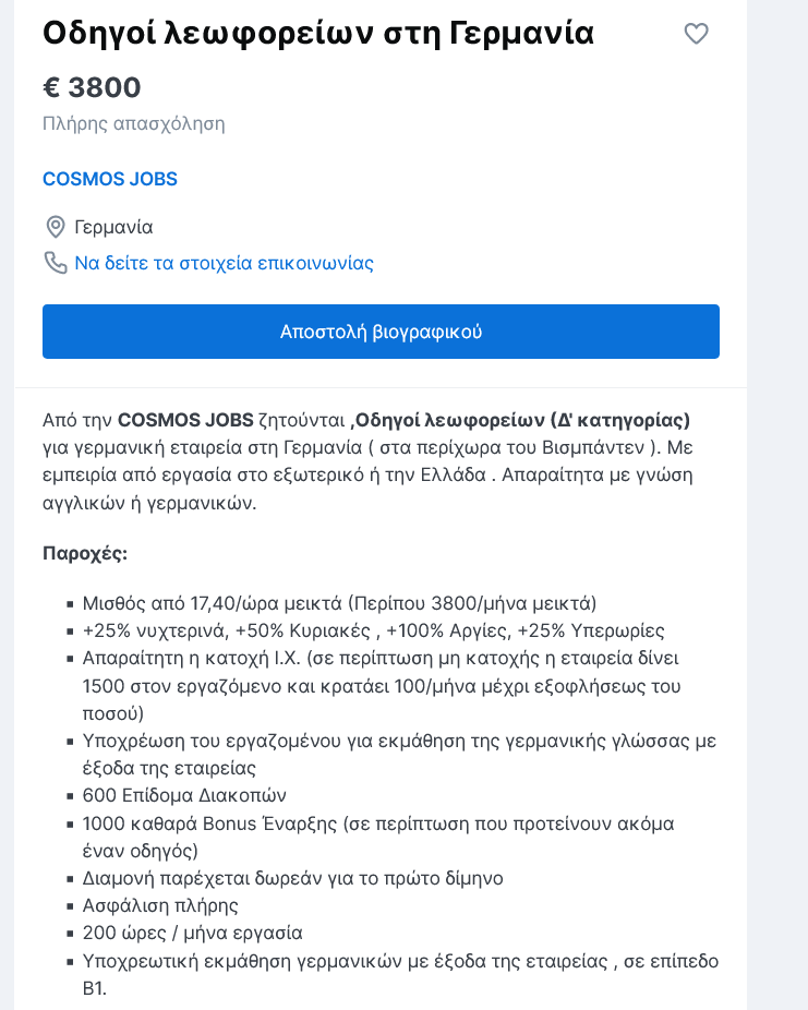 Ενδεικτικά να αναφέρουμε ότι πρόσφατη αγγελία στην Ελλάδα, για εργασία οδηγών στο Βισμπάντεν της Γερμανίας, εταιρία προσφέρει εργασία με αρχικό μισθό 3800 ευρώ μεικτά, εκμάθηση των Γερμανικών με έξοδα της εταιρίας, δάνειο για την αγορά ΙΧ, πλήρη ασφάλιση κ.λ.π.