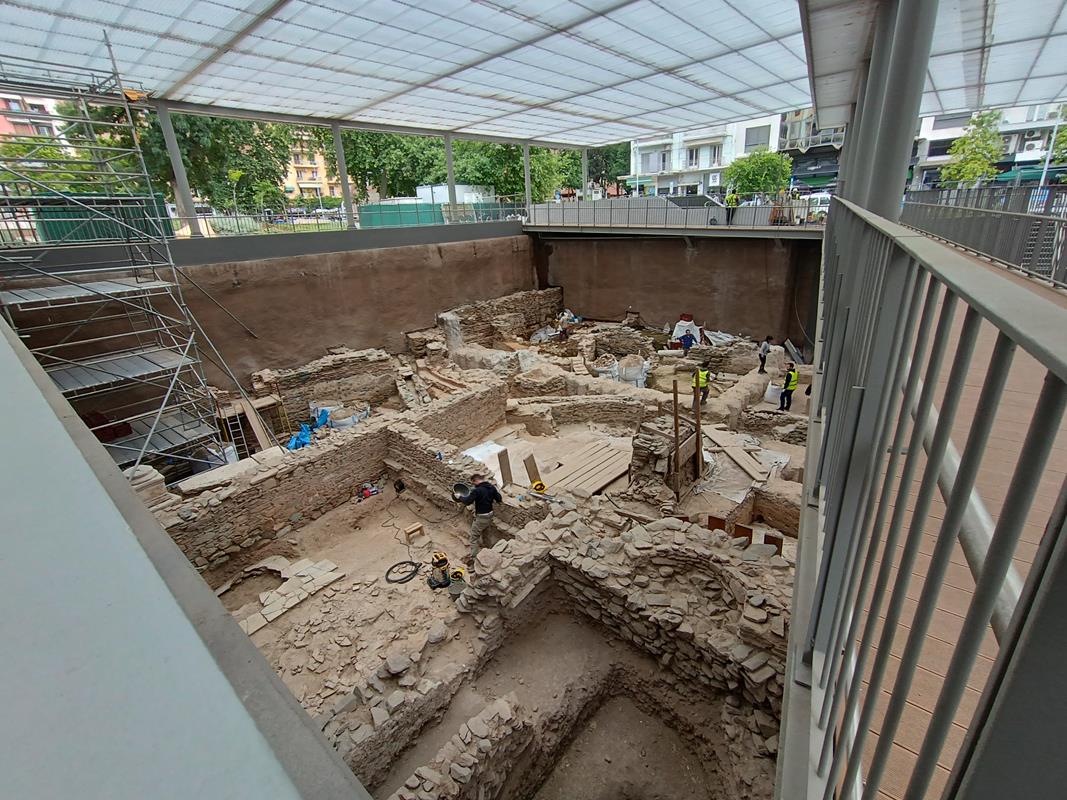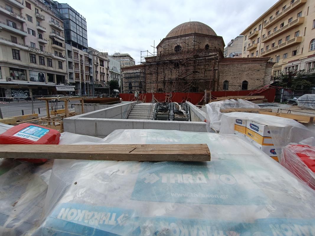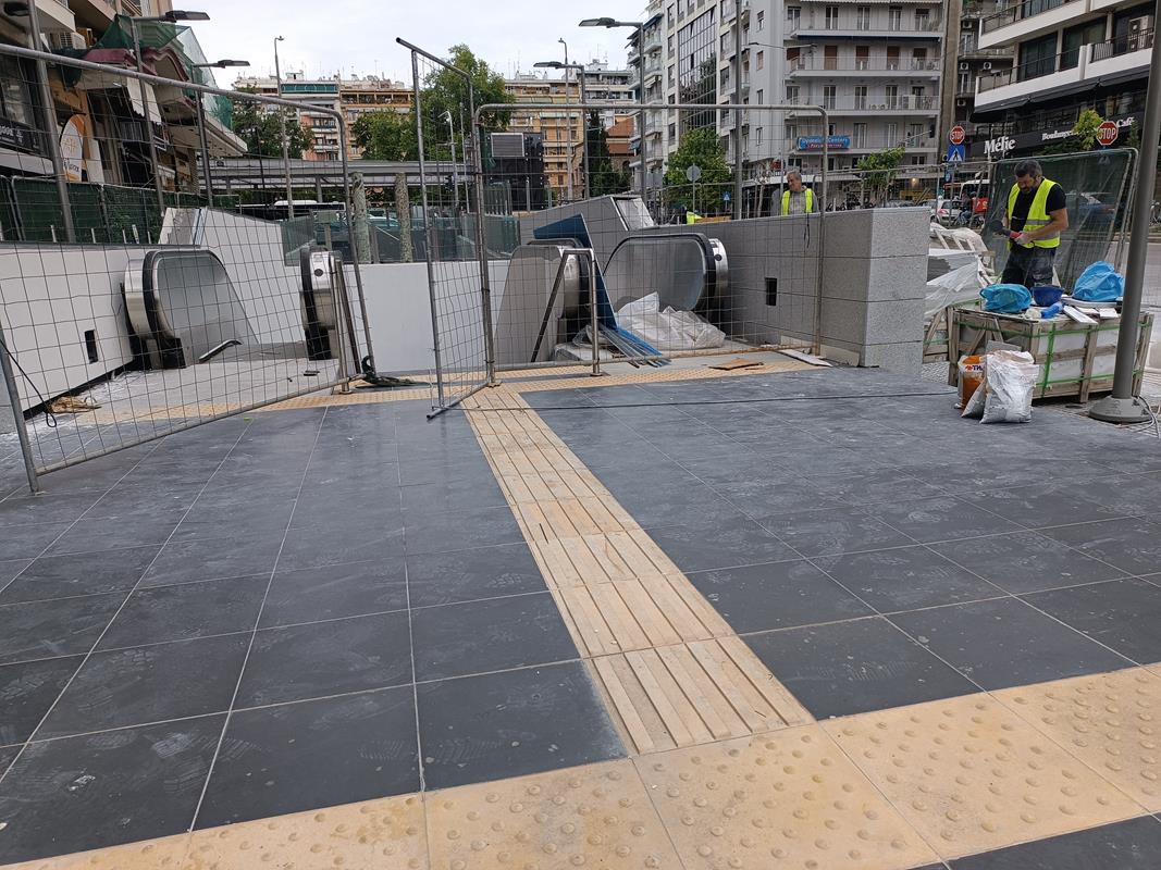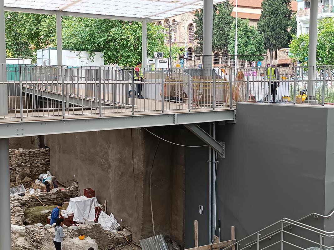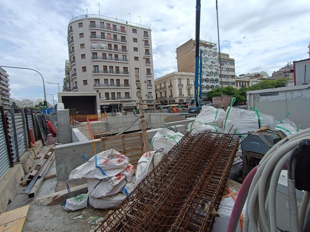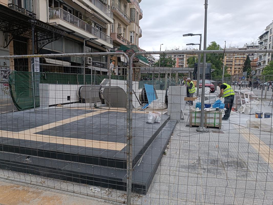 Βρίσκονται σε εξέλιξη εργασίες καθαίρεσης ασφαλτικών – υφισταμένων πεζοδρομίων και τοποθέτησης κρασπέδων και πλακών πεζοδρομίου στη βόρεια πλευρά της οδού Εγνατία, εργασίες κατασκευής ψευδοροφών στον σταθμό, χρωματισμοί, αρχιτεκτονικές εργασίες πρώτου σταδίου στη νότια πρόσβαση, εργασίες εφαρμογής υποστρώματος στο σταθμό, εργασίες για την ανέγερση της πεζογέφυρας του αρχαιολογικού χώρου καθώς και εργασίες εγκατάστασης αεραγωγών και στομίων του συστήματος αερισμού / κλιματισμού. Συνεχίζονται οι εργασίες εγκατάστασης του συστήματος πυρόσβεσης, του συστήματος πυρανίχνευσης και του συστήματος ελέγχου πρόσβασης και ανίχνευσης μη εξουσιοδοτημένης εισόδου, εργασίες εγκατάστασης του εξοπλισμού του ανατολικού φρέατος αερισμού σηράγγων, καθώς και εργασίες εγκατάστασης σχαρών, καλωδίων, φωτισμού και κατασκευής γειώσεων. Βρίσκονται, επίσης, σε εξέλιξη οι εργασίες επανατοποθέτησης και συντήρησης των αρχαιολογικών ευρημάτων / ενοτήτων στο επίπεδο -1, ενώ ολοκληρώθηκαν οι αντίστοιχες εργασίες επανατοποθέτησης των αρχαιοτήτων στην νότια πρόσβαση.