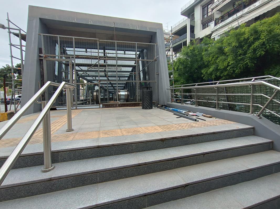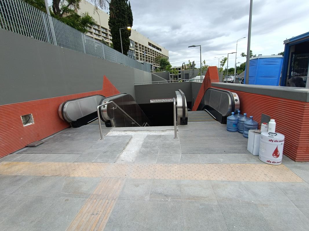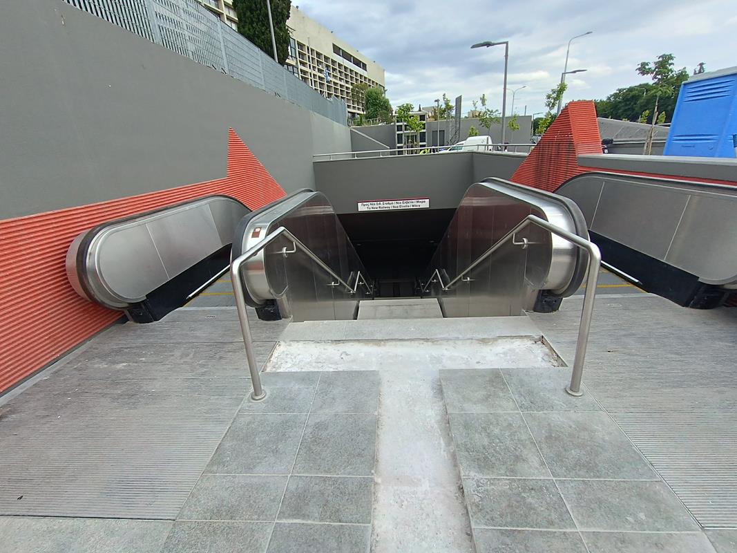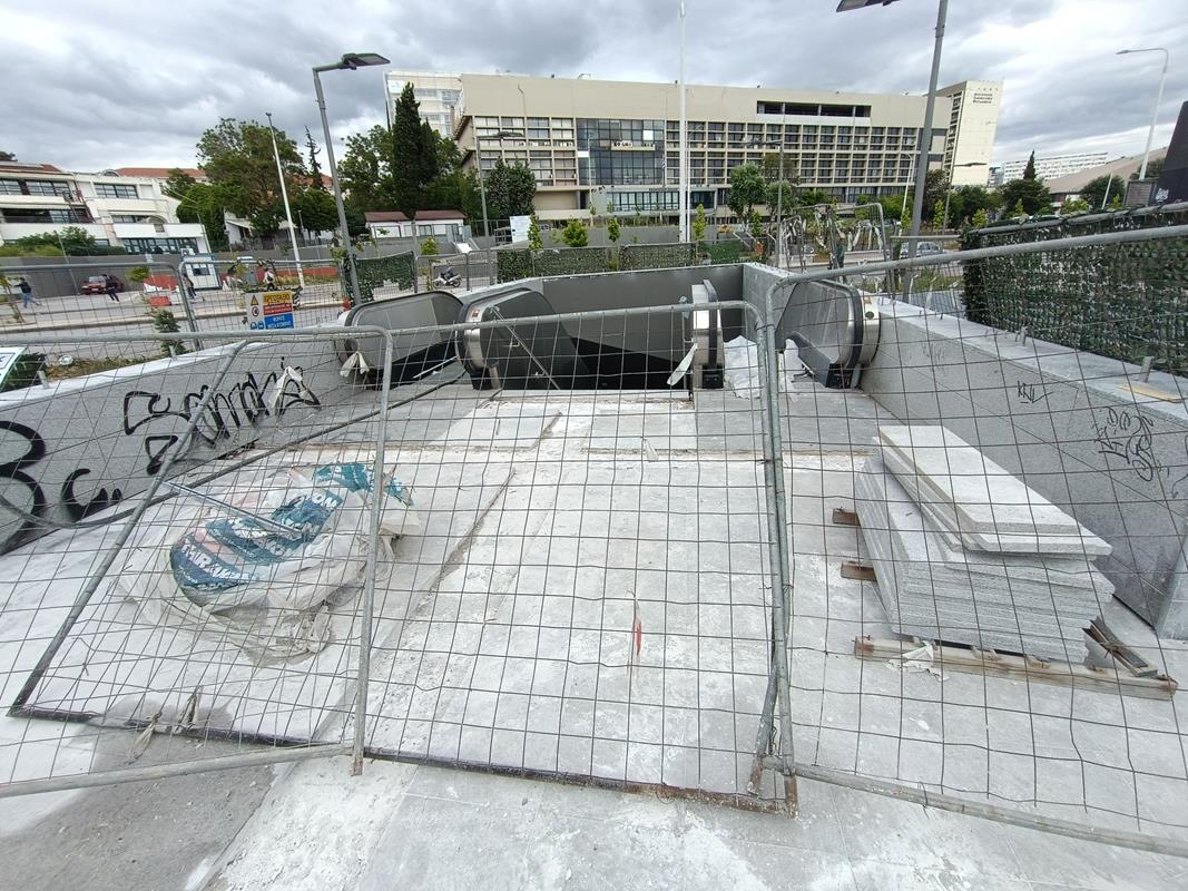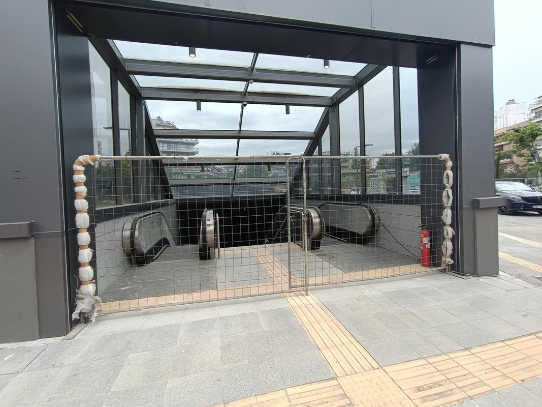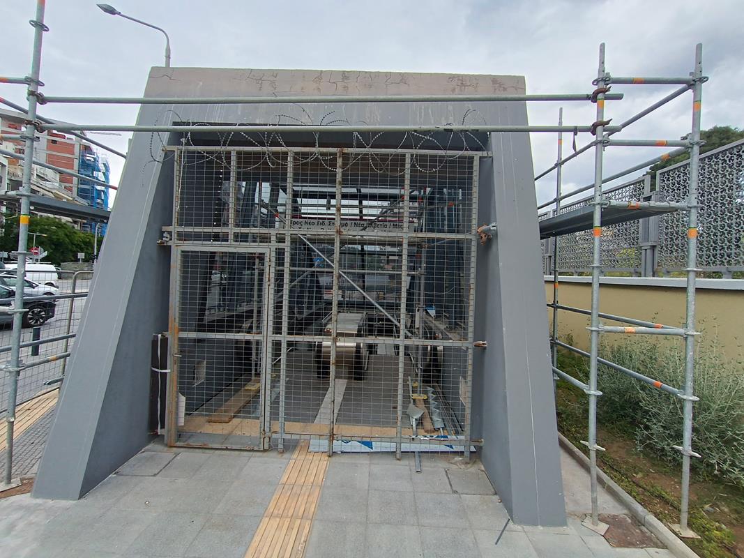 Το στέγαστρο απουσιάζει ενώ κυριαρχούν τα μαδέρια και οι σκαλωσιές. Κατά την εταιρία, στο σταθμό βρίσκεται σε εξέλιξη η κατασκευή του στεγάστρου της πρόσβασης (τοποθέτηση αλουμινίων), καθώς και οι δοκιμές στο σύνολο των εγκατεστημένων ηλεκτρομηχανολογικών συστημάτων.