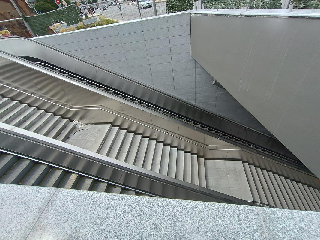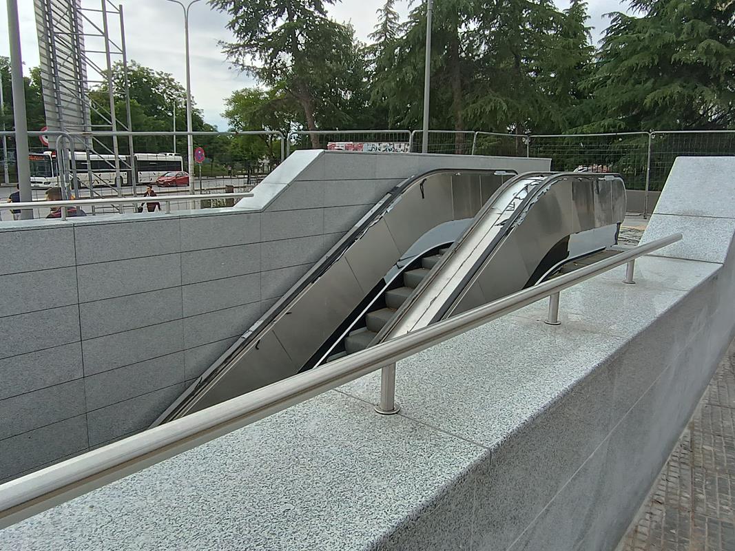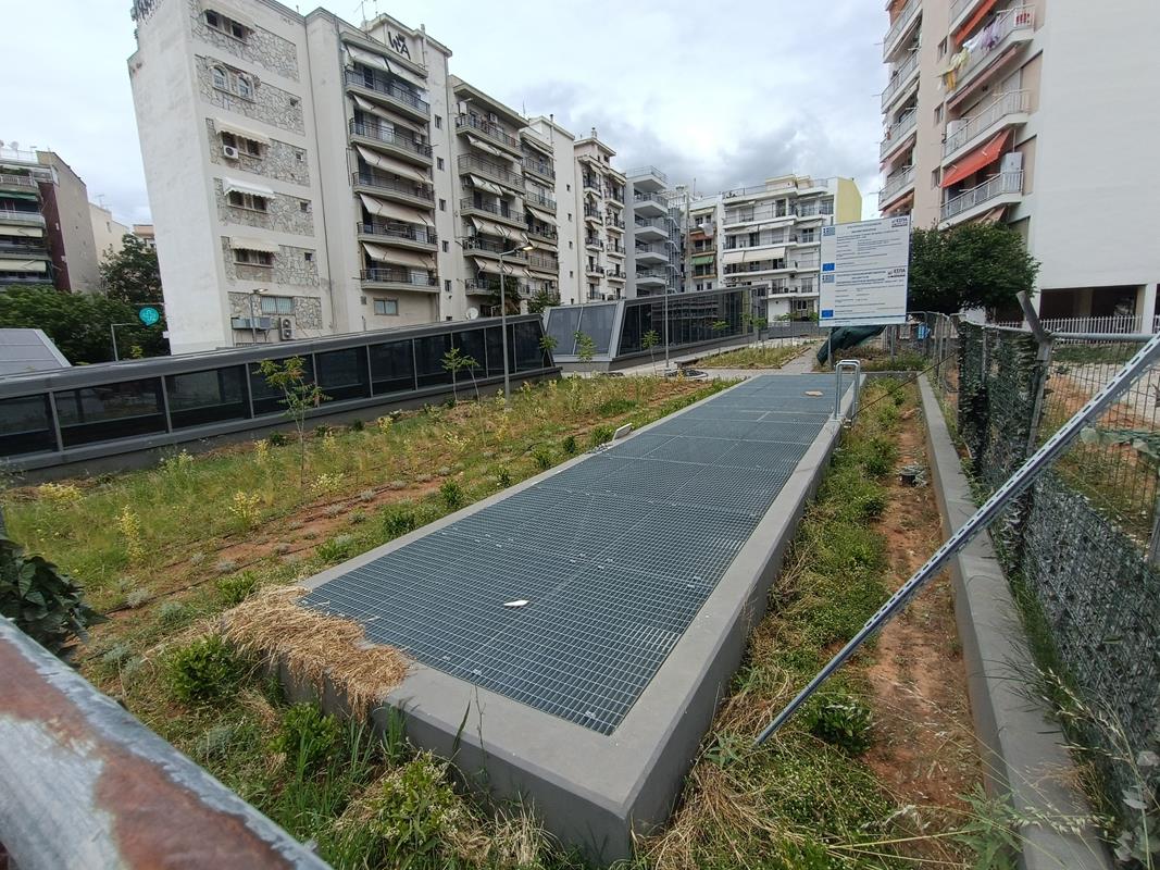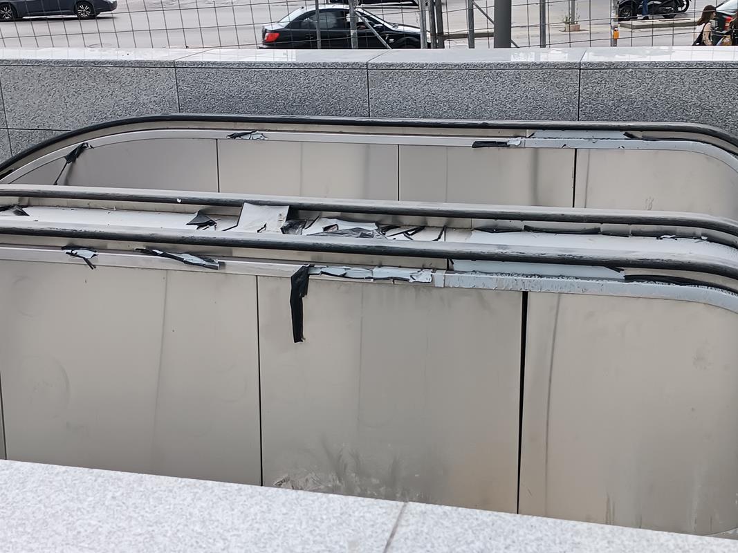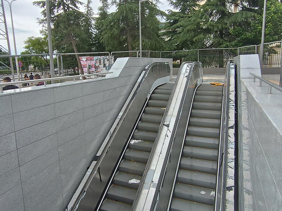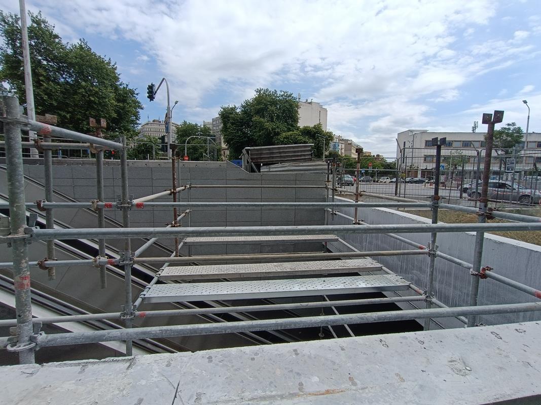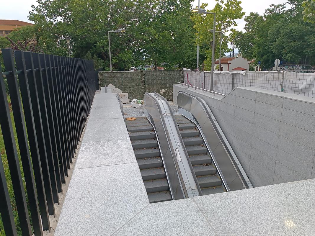 Το στέγαστρο απουσιάζει ενώ κυριαρχούν τα μαδέρια και οι σκαλωσιές. Κατά την εταιρία, στο σταθμό βρίσκεται σε εξέλιξη η κατασκευή του στεγάστρου της πρόσβασης (τοποθέτηση αλουμινίων), καθώς και οι δοκιμές στο σύνολο των εγκατεστημένων ηλεκτρομηχανολογικών συστημάτων.