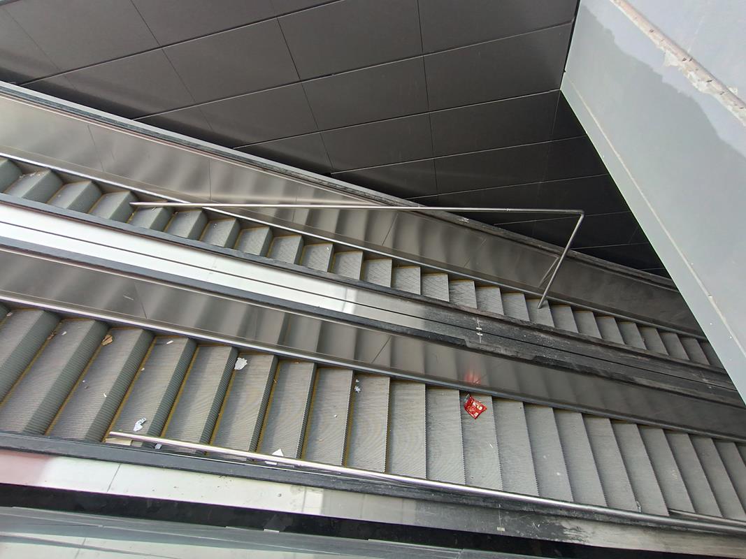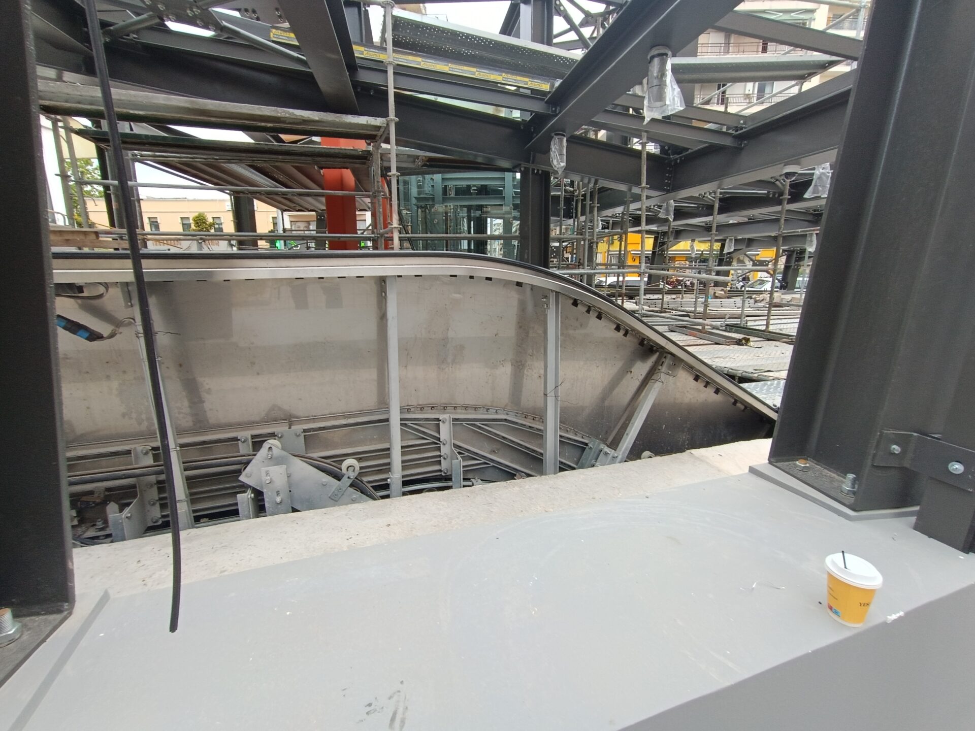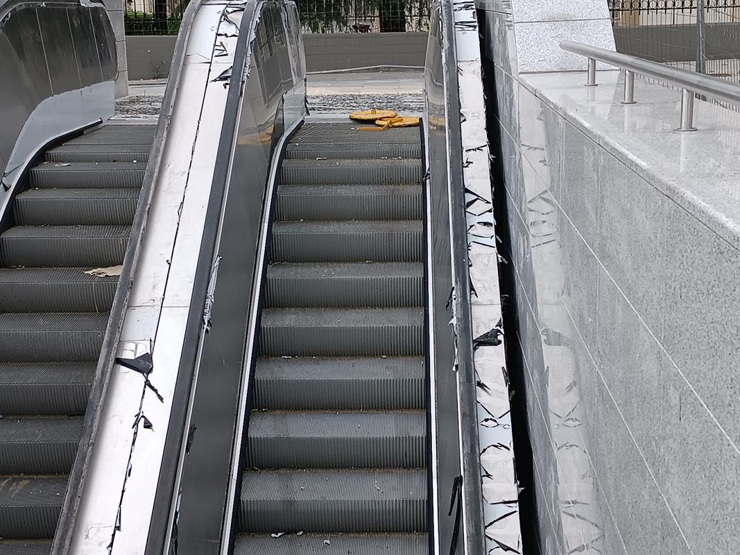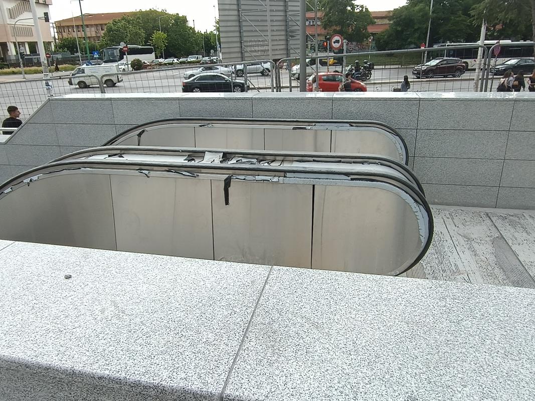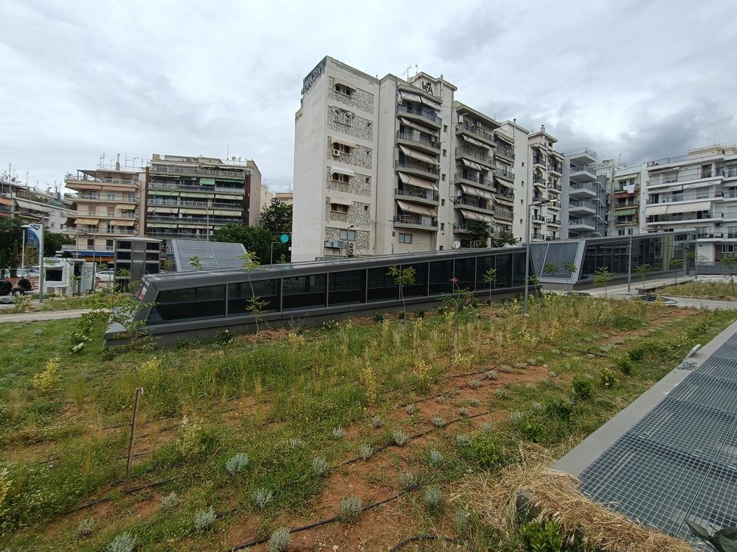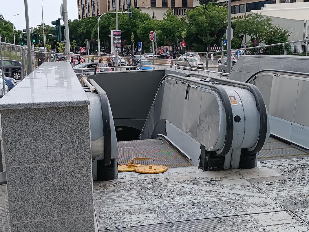 Το στέγαστρο απουσιάζει ενώ κυριαρχούν τα μαδέρια και οι σκαλωσιές. Κατά την εταιρία, στο σταθμό βρίσκεται σε εξέλιξη η κατασκευή του στεγάστρου της πρόσβασης (τοποθέτηση αλουμινίων), καθώς και οι δοκιμές στο σύνολο των εγκατεστημένων ηλεκτρομηχανολογικών συστημάτων.