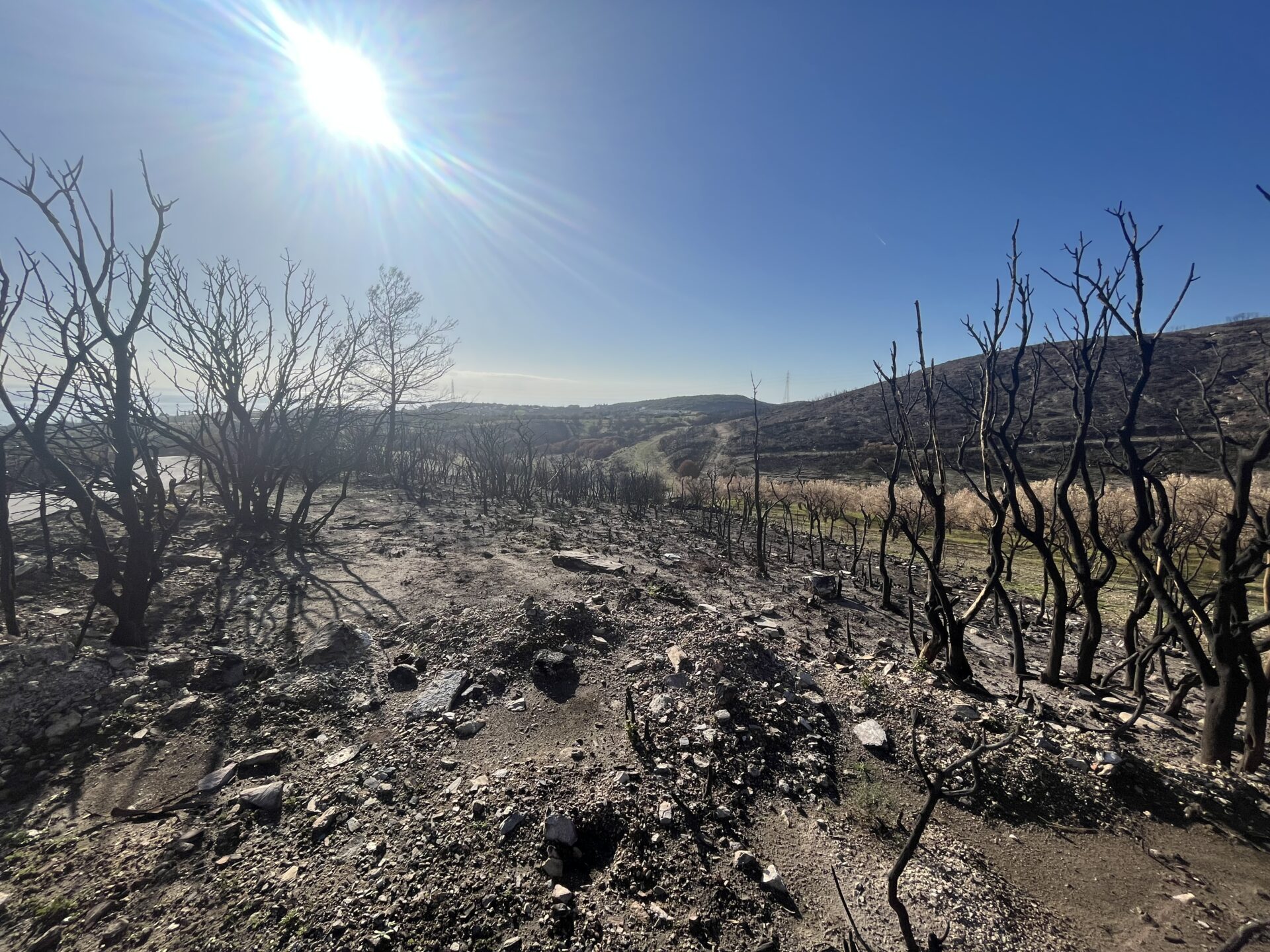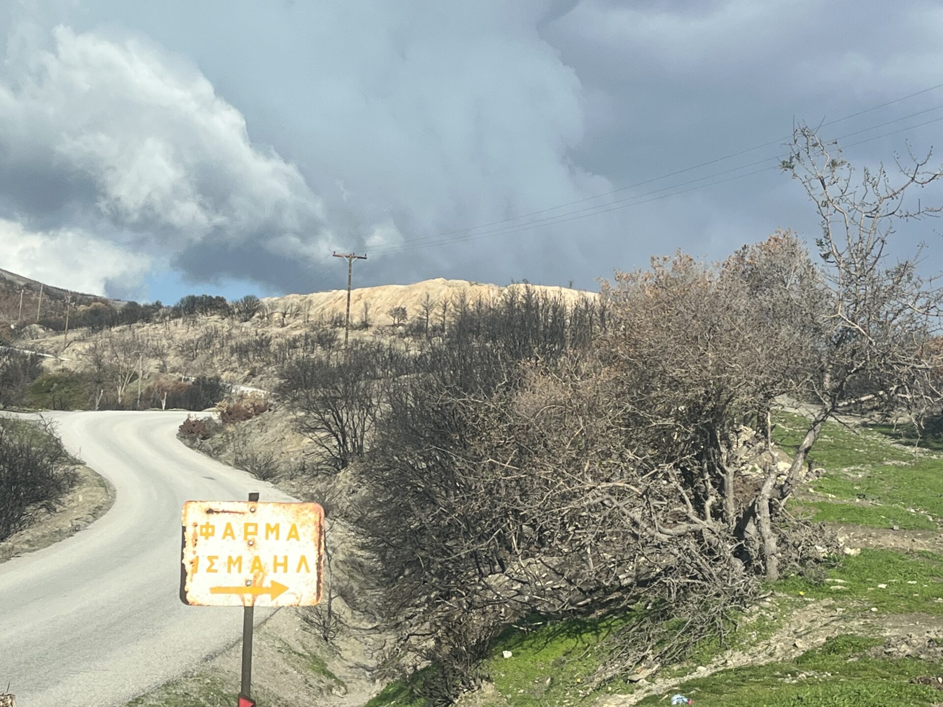 Δίπλα από τον Περιφερειακό, τα χόρτα είναι ξερά, η σφοδρότητα με την οποία πέρασε η φωτιά, ακόμα και αν δεν τα ακούμπησε, σίγουρα τα μάρανε. Μπροστά σου, κάποτε η θεά ήταν ολοπράσινη. Τώρα βλέπεις μόνο μαύρο.