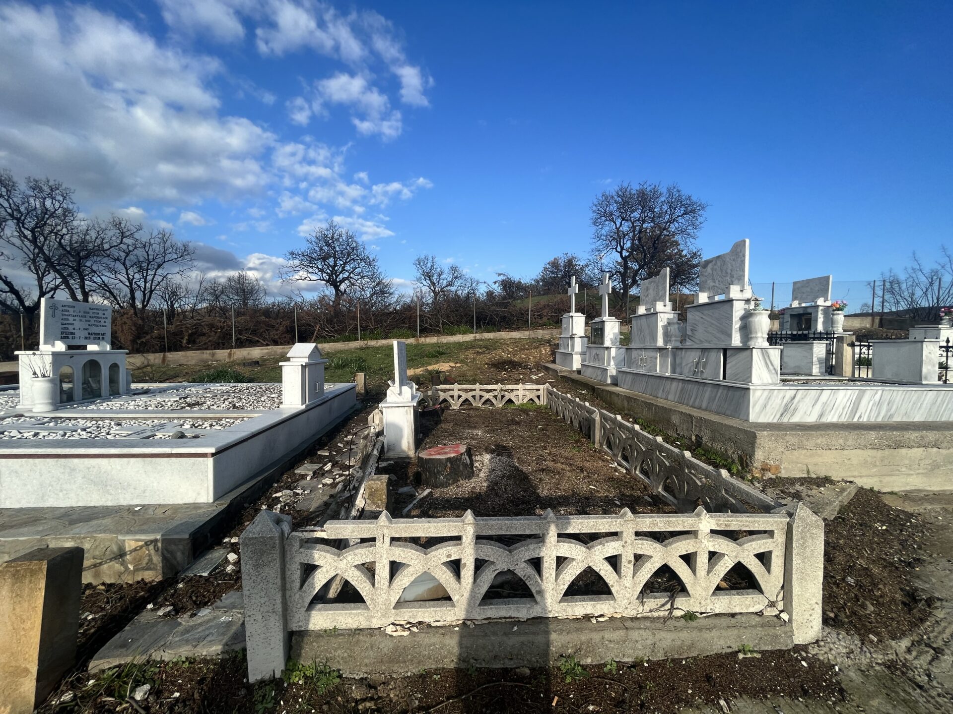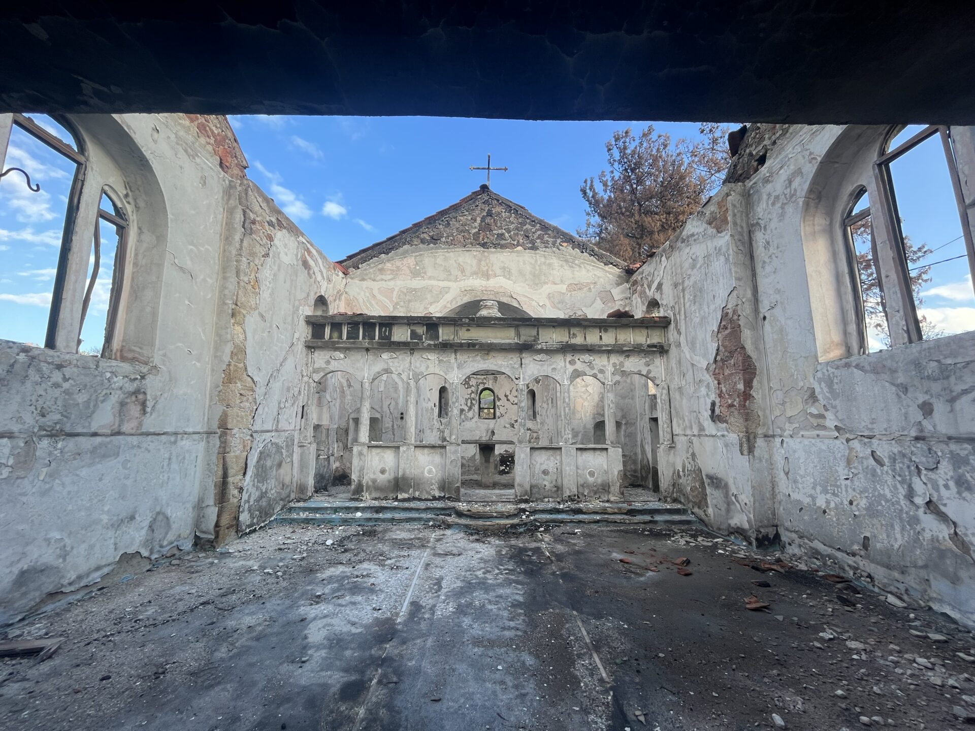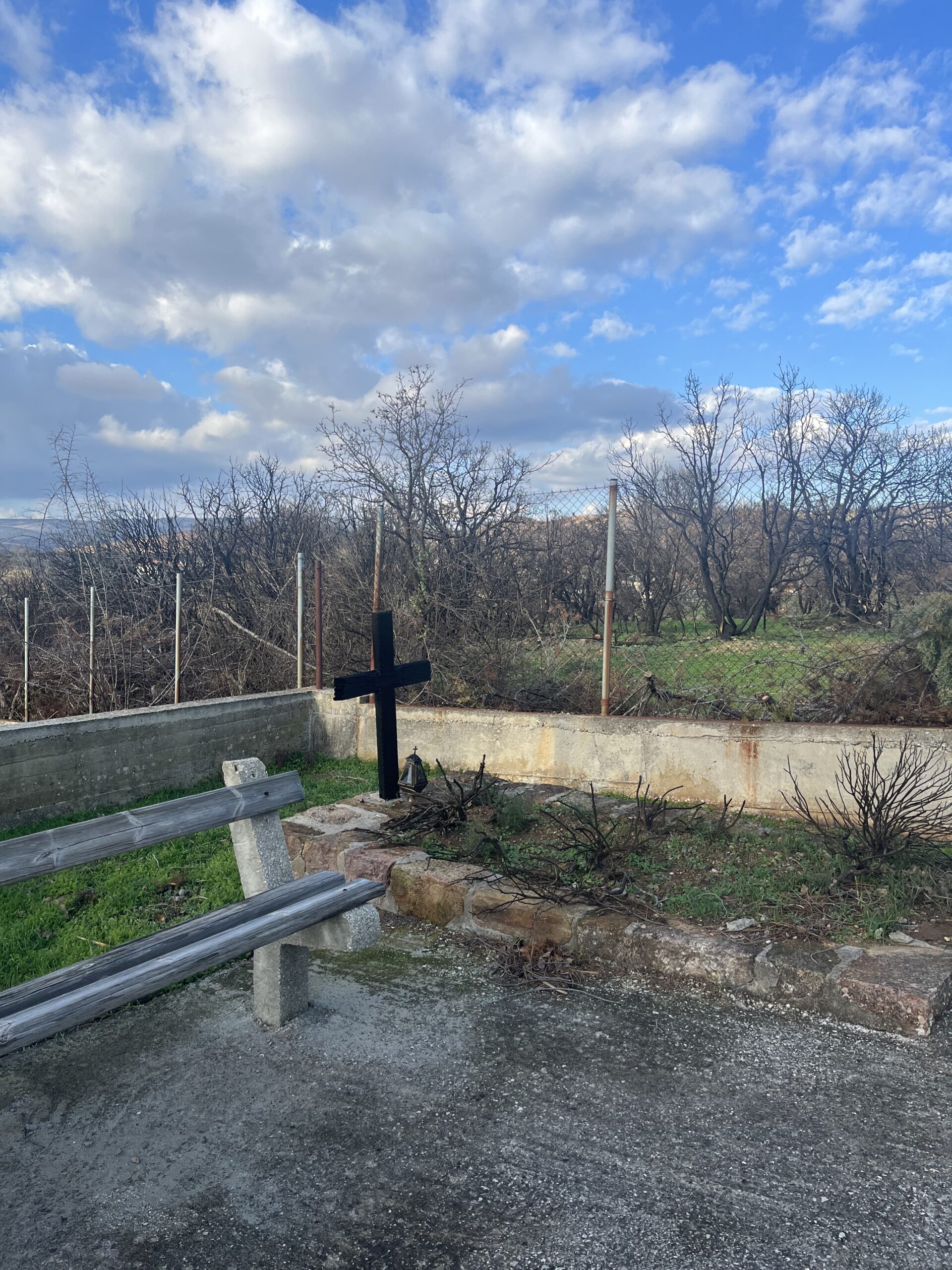 Περάσαμε από τα μνήματα, που κάποτε περιτριγυρίζονταν από δέντρα δίπλα από τους τάφους, για να δίνουν μια ανάσα “ζωής” στον χώρο. Τώρα, γύρω – γύρω, μόνο αποκαΐδια, ξερά και μαύρα κλαδιά και κομμένα, από τη ρίζα, δέντρα. Το πράσινο είναι λιγοστό και μετρημένο. Το παρεκκλήσι, καρβουνιασμένο στις άκρες του και από θαύμα στέκεται ακόμα όρθιο.