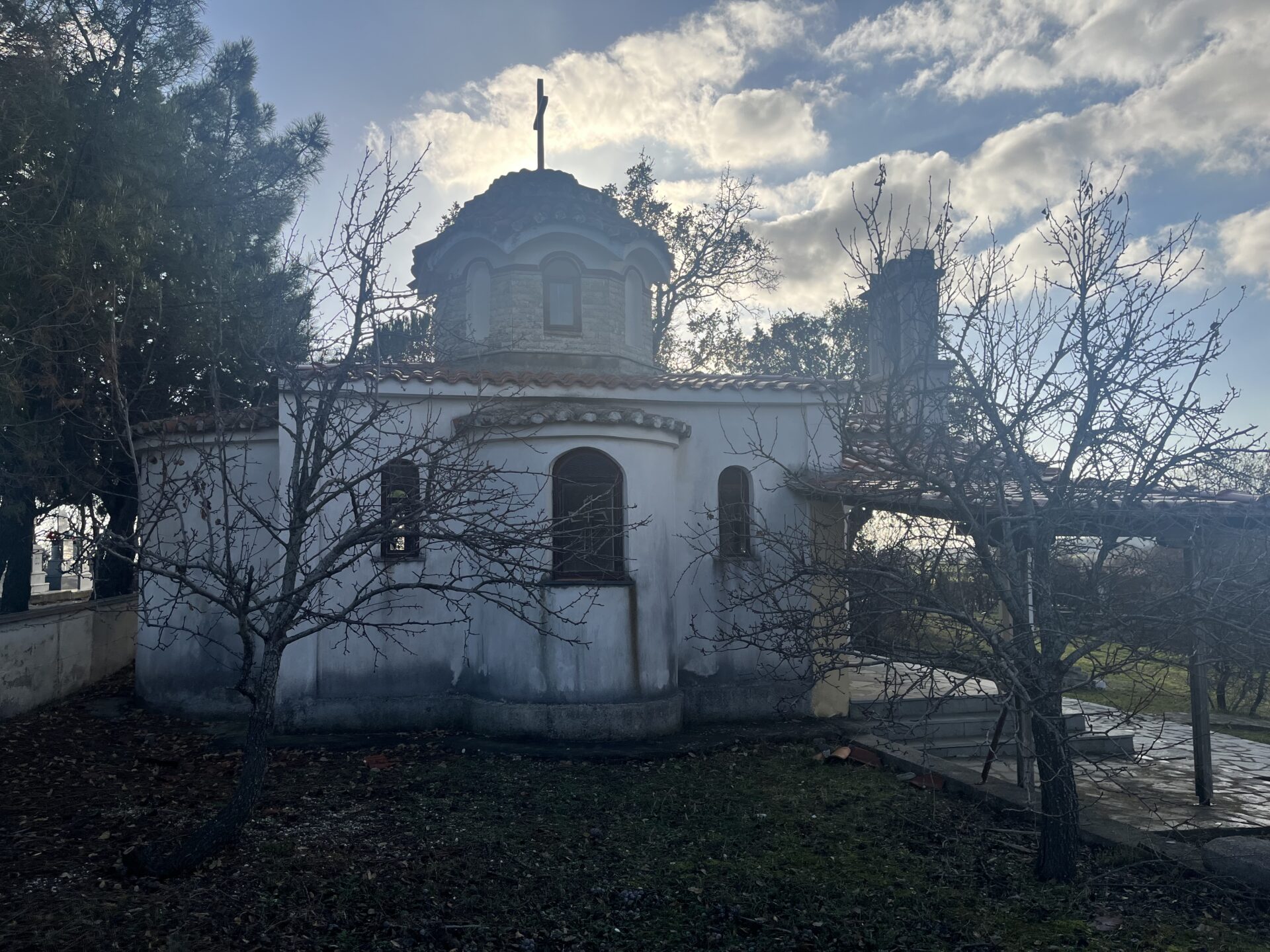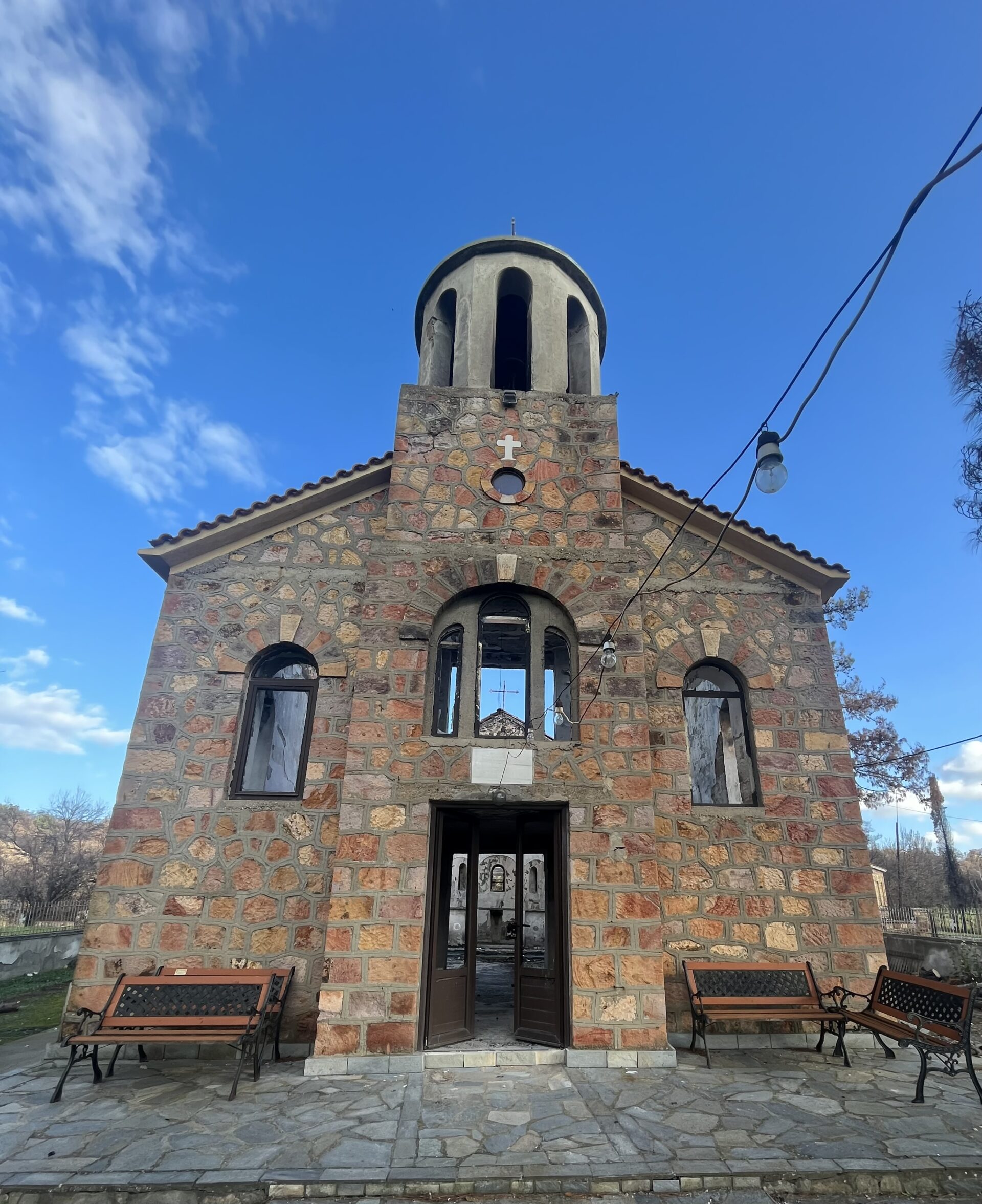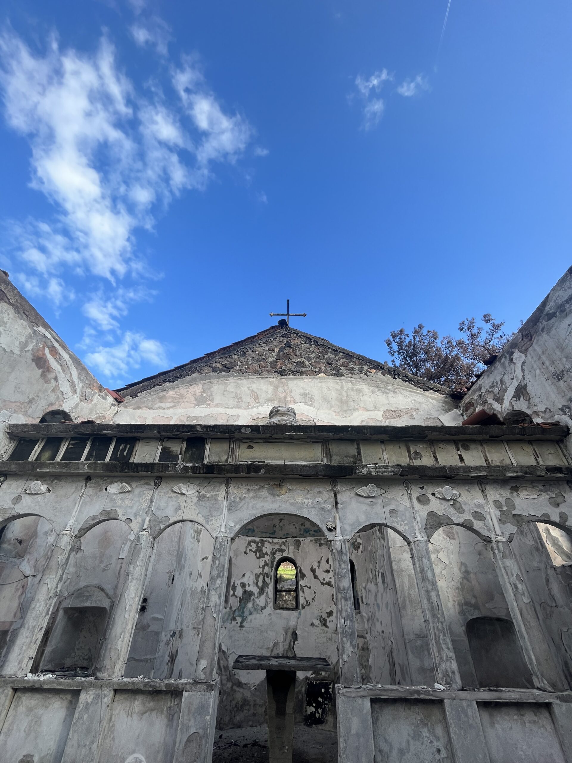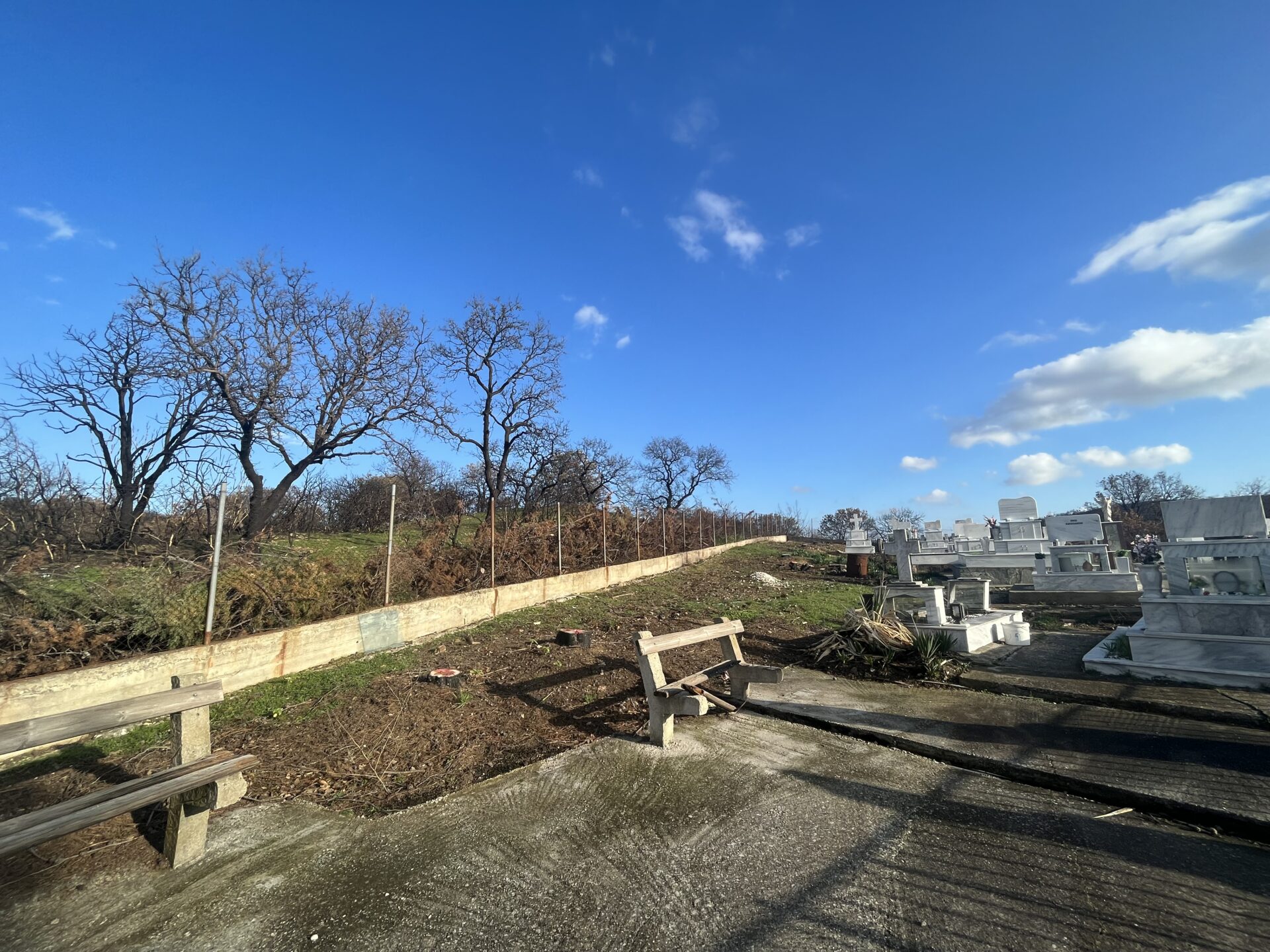 Περάσαμε από τα μνήματα, που κάποτε περιτριγυρίζονταν από δέντρα δίπλα από τους τάφους, για να δίνουν μια ανάσα “ζωής” στον χώρο. Τώρα, γύρω – γύρω, μόνο αποκαΐδια, ξερά και μαύρα κλαδιά και κομμένα, από τη ρίζα, δέντρα. Το πράσινο είναι λιγοστό και μετρημένο. Το παρεκκλήσι, καρβουνιασμένο στις άκρες του και από θαύμα στέκεται ακόμα όρθιο.